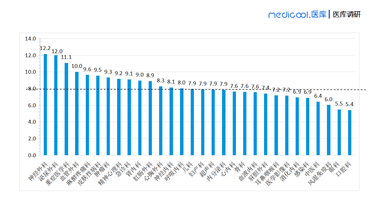 到底哪些科室的医生收入比较高呢?我们可以发现位居榜首的是神经外科,其次是泌尿外科,而重症医学科、血管外科、麻醉疼痛科的医生收入分列第三、第四和第五位。
