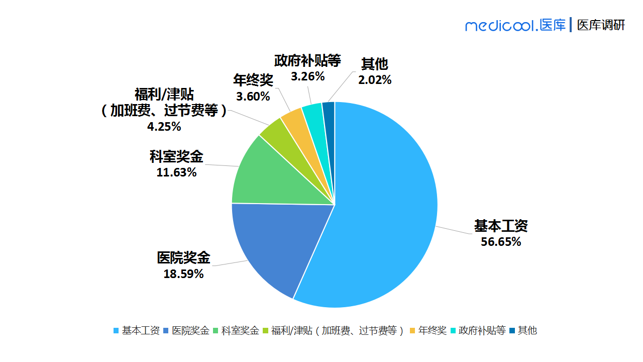 医生收入到底是有哪几个部分组成呢?从调研数据来看,基本工资占医生总收入的一半以上,医院和科室奖金占医生收入的30.22%,而福利津贴、年终奖、政府补贴等仅仅占收入的很小一部分。