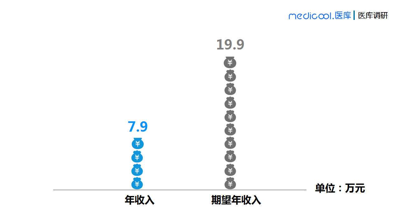 调研数据显示,医生期望的税后平均年收入是19.9万元,与目前年收入相差12万元,看来理想很丰满,现实很骨感啊。