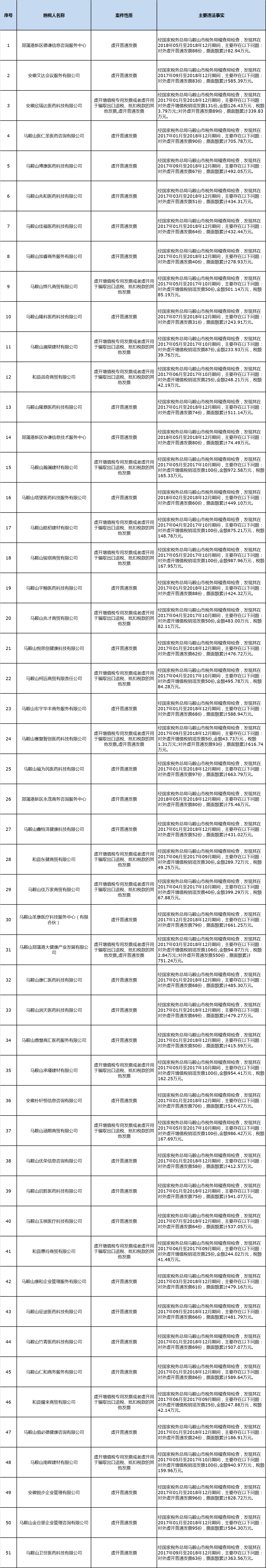 CSO虚开发票的问题必然会涉及到收票药企。一直以来,医药企业以咨询费、会议费、广告费等大量大额发票频繁入账,药品流通领域存在多票制、过票洗钱等乱象。正因如此,医药企业和延伸检查单位是否遵守会计法律法规、会计财务制度、内部控制规范以及国家财税政策等有关情况,与财务管理相关的费用、成本、收入的真实性,一直是国家税务部门治乱的重点领域之一。马鞍山税务和莆田市税务局的抽查结果都在提醒药企和CSO,药企必须对CSO进行穿透式的管理,防止到协查的时候才发现CSO存在“重大税收违法问题”,造成无法补救的后果。不要有因为新冠疫情的出现、经济面临严峻的形势而产生其他不切实际的想法。一旦被稽查,补缴税款是小事,还要缴纳大量的滞纳金和税务行政罚款,构成犯罪的,甚至还要承担刑事责任!附:马鞍山税务局发布《重大税收违法案件信息公告2020年3月》,共列出51家“重大税务违法”企业: