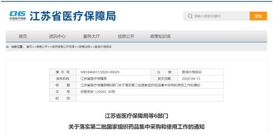 江苏省医保局等6部门联合印发《关于落实第二批国家组织药品集中采购和使用工作的通知》,通知明确,自2020年4月27日起,江苏省全面执行第二批国家组织药品集中采购中选结果和各项配套政策。第二批国家集采药品共涉及抗肿瘤药、糖尿病用药、高血压用药、降血脂用药等15类适应症的32种药品,平均降价幅度达到53%,预计可节约资金11亿元。