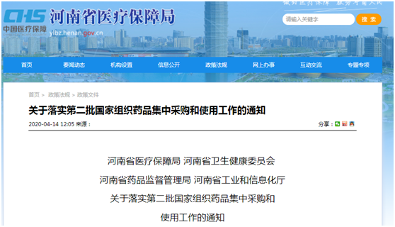 河南省医疗保障局等四部门印发《关于落实第二批国家组织药品集中采购和使用工作的通知》,决定全面实施第二批国家组织药品集中采购结果,要求各级医药机构于2020年4月30日前全面执行。
