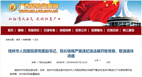 4月27日,广西纪检监察网发布消息通报已退休的桂林市人民医院原院长钱畅涉嫌受贿犯罪,被开除党籍并取消退休待遇。有受贿历史的院长,在位时没有被调查,退休后就可以安全着陆,平安无事享受退休待遇了吗?不是。在关系纪检监察通报的这个案例中,院长即使退休了4年,有严重违纪违法行为,一样被调查,被开除党籍、取消退休待遇。通报称,经查,钱畅在担任桂林市人民医院院长职务期间,利用职务便利,在医疗设备、药品采购等事项上,为他人谋取利益,单独或伙同他人收受财物,数额特别巨大,涉嫌受贿犯罪。通报称,钱畅利用手中权力进行权钱交易,且在十八大后仍不收敛、不收手,情节严重,影响恶劣,应予严肃处理。根据《中国共产党纪律处分条例》《中华人民共和国刑法》《中华人民共和国监察法》《事业单位工作人员处分暂行规定》等有关规定,决定给予钱畅开除党籍处分,取消退休待遇,将其涉嫌职务犯罪问题移送检察机关依法审查起诉,对其违纪违法所得财物予以收缴。钱畅被查前半个多月,2019年9月26日,桂林市人民医院党委委员、副院长刘桂勇,器械科科长林涛涉嫌严重违纪违法被查。2019年12月,刘桂勇、林涛相继被开除党籍、公职,两人均涉嫌受贿犯罪。桂林市纪委监委通报称,刘桂勇在桂林市人民医院、桂林市中西医结合医院任职期间,违反中央八项规定精神和廉洁纪律,违规收受他人礼金;违反国家法律法规规定,利用职务上的便利为他人谋取利益,非法收受他人财物,涉嫌受贿犯罪。通报给予刘桂勇开除党籍、公职处分,将其涉嫌职务犯罪问题移送检察机关依法审查起诉,对其违纪违法所得财物予以收缴。林涛在桂林市人民医院任职期间,违反中央八项规定精神和廉洁纪律,收受管理服务对象财物;违反国家法律法规规定,利用职务上的便利为他人谋取利益,非法收受他人财物,涉嫌受贿犯罪。通报给予林涛开除党籍、公职处分,将其涉嫌职务犯罪问题移送检察机关依法审查起诉,对其违纪违法所得财物予以收缴。