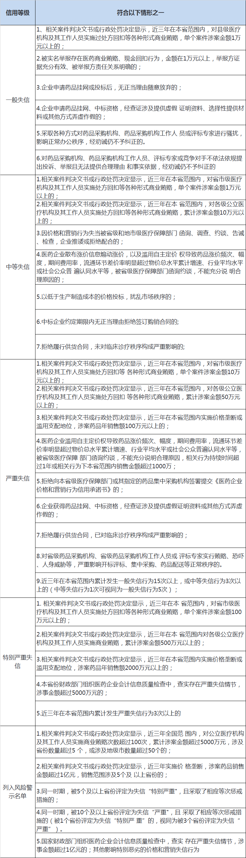 4-5、建立医药企业价格和营销失信行为信用评价制度与分级惩戒制度。按照医药企业失信行为的性质、情节、时效,以及影响范围等因素,将医药企业失信情况评定为一般、中等、严重、特别严重四个等次,四个信用评价等级,惩戒与集采、挂网、配送以及“欺诈骗保”挂钩。