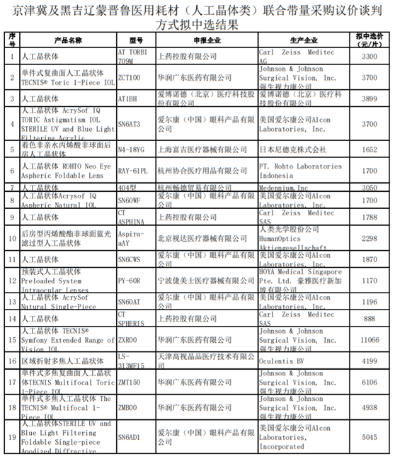 1、此前公布的京津冀联盟高值耗材带量采购的执行方案中,明确提出的带量采购的高值耗材种类除了人工晶体类高值耗材外,还有心脏介入、外周血管介入、人工关节、其他脏器介入替代等耗材。在这次人工晶体耗材谈判结束后,这些种类的耗材带量采购也一定会很快落地。也就是要实现在手术中使用量较大、价格相对昂贵的医用耗材以量换价。这一次九省联盟的带量采购涉及人工晶体共有31.39万片,年采购金额9.34亿元,议价之后的成交价格为6.42亿元。总共有19个人工晶体产品中标入选,“团购”过后价格平均降幅为54.21%,最高的降幅达到了84.73%。跨省带量采购成效非常显著。