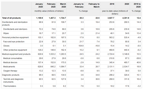 2020年1-3月,加拿大医疗设备和医用产品、诊断产品以及消毒剂和杀菌产品的出口显着增加,而个人防护设备出口与2019年第一季度相比有所下降。1、在该期间内,医疗设备和医用产品的出口额比去年同期增长了15.5%,达到31亿美元。出口产品主要运往美国和意大利。3月份医疗设备与产品出口比2月增长24.2%,至13亿美元。2020年第一季度,药品、医疗设备和氧气设备的出口增加,但医疗耗材出口的减少部分抵消了这一增长。(1)药品出口增长得益于出口到美国的抗生素药物,以及出口到意大利的其他未分类药物,这些导致了药物出口的增加。(2)在医疗设备方面,出口美国和荷兰的医疗或兽医学中使用的仪器和器具的出口量增加。(3)医疗消耗品的下降主要是由于针头、导管、套管等向美国和荷兰出口减少的结果。2、2020年第一季度,诊断产品的出口额比去年同期增长了15.1%,达到3.29亿美元。3月,出口额较2月增长了34.8%,达到1.34亿美元。测试套件和诊断仪器在2020年第一季度出口增长了16.4%。3、2020年第一季度,消毒剂和杀菌产品的出口与2019年同期相比增长了14.4%,达到2.91亿美元。2020年,第一季度的每个月都有所增长,最显着的是三月份比二月份,增长了19.4%,达到1.1亿美元。增长的主要来源是,消杀试剂向美国和中国的出口量增加,消毒湿巾对美国的出口量增加。4、相比之下,2020年第一季度,个人防护用品出口比去年同期下降4.9%,至5.35亿美元。其中对美国出口的下降(-2510万美元),对中国出口增长(+770万美元)。尽管该季度每个月的出口都有所增加,但月度值却低于2019年初,其他防护装备(-6.2%)和手套(-8.0%)的出口减少了,而面部和眼睛防护用品(+ 3.4%)增加了。