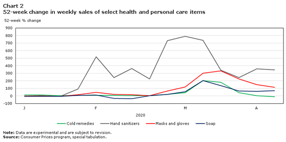 在三月的第一周,洗手液的销量比去年同期增长了792%。直到4月11日洗手液产品的需求仍然强劲,销售增速虽有放缓,但仍比去年同期增长345%。并非口罩增速最快,洗手液才是销售增速最高的产品。加拿大对洗手液的需求如此之高,以至于联邦政府已开始批准非传统制造商(例如蒸馏厂)的产品许可证来生产洗手液。口罩和手套的销售从三月也开始大幅增长,与去年同期相比,增速最高达到300%,截至4月11日的一周中口罩和手套(+ 114%)的销售仍然很高。口罩和手套销售增速下降也和市场短缺有关。感冒药经历了短暂的增长后,基本恢复到新馆疫情之前的水平。肥皂的销售仍然处于增长中,截止4月11日的一周,比去年统计增长68%。