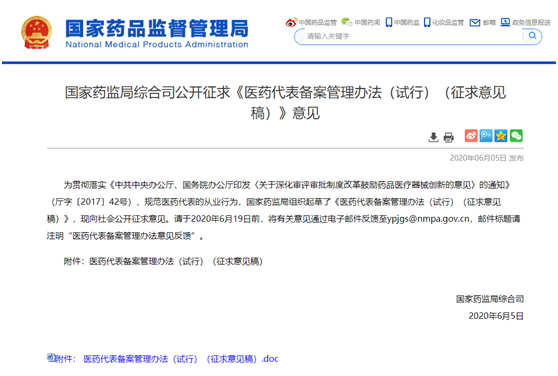 6月5日,备受业界瞩目的《医药代表备案管理办法(试行)》(征求意见稿)(以下简称《征求意见稿》)再次公开征求意见。《征求意见稿》共有18条,征求意见截止时间为6月19日。实际上,2017年12月就出台了“史上最严”的《医药代表登记备案管理办法(试行)(征求意见稿)。而此次新的《征求意见稿》发布,距离上一次征求意见已经两年多时间。本次《征求意见稿》全面贯彻落实新修订《药品管理法》,贯彻药品上市许可持有人对药品承担全生命周期管理责任理念。与上一稿征求意见稿相比,《征求意见稿》对医药代表的专业学历未再提出具体要求,而是由药品上市许可持有人对医药代表能力进行把关;并明确由药品上市许可持有人对医药代表的行为进行约束、纠正和规范。