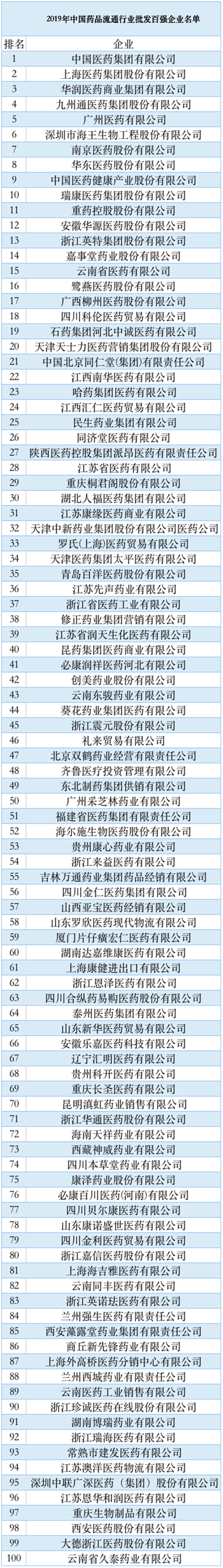 根据医药云端统计,上药系拿下28个品种配送资格,采购金额约为1.2335亿元,占55个品种采购金额的62%;国控系拿下25个品种,采购金额约为7022万元,占比约35%,两家公司合计占比约96%。上药不仅品种数量超过国控,更为重要的是采购金额远超前者,第三批国采首年约定采购金额排名前6的品种,富马酸喹硫平片、卡培他滨、甲钴胺、来曲唑、舍曲林、替格瑞洛,全部被上药系收入囊中。国药集团在全国范围内依然实力雄厚。而九州通仅获得二甲双胍片一个品种的配送资格,金额约为126万元,美罗医药获得非那雄胺的配送资格,金额约为573万元。近期,中国医药商业协会对外发布了2019年中国药品流通行业批发百强企业名单。从历年公布的百强榜单来看医药商业排名及格局。强者恒强的局面已成定局。国药、上药、华润、九州通、广药在近三年中依然霸占前五。并且随着2016年-2017年实施两票制之后以及药品集采强势推行下,央企和地方性国企获得了压倒性的市场份额,市场集中度提高地位更加稳固。但除此之外,百强榜中大多数企业的排名均有不同程度的变化。尤其是百强榜中已经有不少企业,例如民生药业、重庆长圣、山西康美徕排名连续下滑,甚至已经难觅踪迹。中小配送商出局之势无法扭转!附中国药品流通行业批发百强企业的排名。主要是依据2019年国内药品批发企业的主营业务收入。