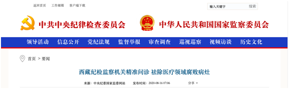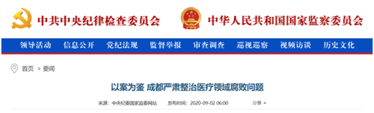 9月2日,中央纪委国家监委网站发布《以案为鉴 成都严肃整治医疗领域腐败问题》一文。上文显示,成都市龙泉驿区第一人民医院原设备物资供应科主任利用职务上的便利,采取违规方式为相关人员在药品供应、设备采购等方面谋取利益,收受贿赂68万余元。如2013年至2019年,上述人士通过透露采购计划、提供招标参数等方式,帮助某医用设备耗材供应商沈某持续承接区一医院医疗设备和耗材业务,先后收受沈某所送人民币共计16.84万元。2020年1月,都泉驿因严重违纪违法,受到开除党籍、开除公职处分。2020年7月,都泉驿因犯受贿罪,被判处有期徒刑3年,并处罚金人民币20万元。8月16日,中央纪委、国家监委官方网站发布《西藏纪检监察机关精准问诊 祛除医疗领域腐败病灶》的文章。文章指出,西藏自治区纪委监委联合调研组发现,“医疗领域腐败涉案环节相对比较集中,主要发生在医药购销、医院基建、医保资金管理使用等方面”。西藏自治区纪委监委党风政风监督室主任刘逢春说,通过梳理案件发现,涉案人员点多面广——从自治区到市、县、乡各级医院、医疗机构,从领导干部到财务、招标、采购等重点岗位人员均有涉及。西藏自治区纪委监委制定专项整治方案,着力整治各级医疗机构主管部门领导干部特别是一把手腐败问题;整治各级医院、医疗机构财务,药品销售、采购、招标等关键环节人员腐败问题等。8月14日,中央纪委国家监委网站发布《反腐三人谈丨驻卫健委纪检监察组:强化政治监督严查违规违纪违法问题》一文,要求捕捉腐败问题,官方公布医疗领域监管重点:一是腐败问题,二是骗保问题。受监管制度体系不健全、激励约束机制不完善等因素制约,医保基金使用效率不高,“挂床”、超范围经营、小病大治、过度检查用药、套高收费、分解收费、串换收费等欺诈骗保手段层出不穷。中央纪委国家监委驻国家卫生健康委纪检监察组副组长杨威表示:今年最重要的工作之一是,切实做好医疗保障基金监管情况监督。要坚决查处医疗机构内外勾结欺诈骗保行为,建立和强化长效监管机制。2019年9月起,国家医保局结合打击欺诈骗保工作总体形势,开展了较大规模的医保基金监管飞行检查,发现了一些医疗机构存在严重的违规违纪甚至违法问题,比如,发现某省2家医院存在违规使用医保资金数千万元的问题。我们及时将有关情况向国家卫生健康委党组进行了通报,督促其落实对公立医院监管的主体责任。8月4日,中央纪委国家监委网站发布《重点领域正风反腐观察 深挖彻查医疗腐败》称,要坚决查处医疗领域严重违纪违法行为。今年上半年披露的医疗领域腐败案件中,收取药品耗材回扣是出现频率最高的问题,涉案金额居高不下,腐败利益链条环环相扣。