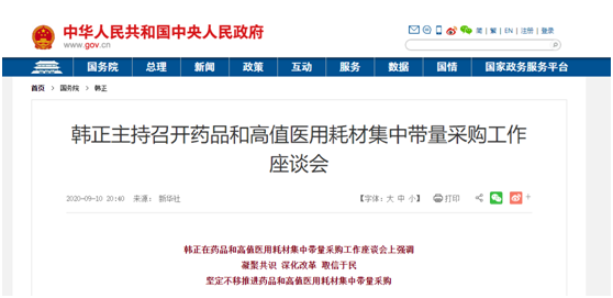 中共中央政治局常委、国务院副总理韩正10日主持召开药品和高值医用耗材集中带量采购工作座谈会,会议主要研究部署药品和高值医用耗材集中带量采购工作。