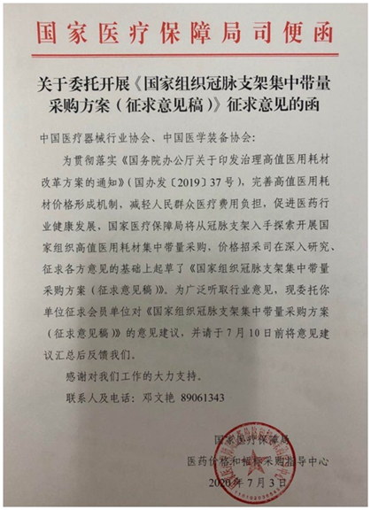 今年7月,国家医疗保障局医药价格和招标指导中心发布了关于委托开展《国家组织冠脉支架集中带量采购方案(征求意见稿)》征求意见函。在首批国家级带量采购中,本次集中带量采购标的为冠脉支架产品,应经药监部门批准获得有效医疗器械注册证材质。
