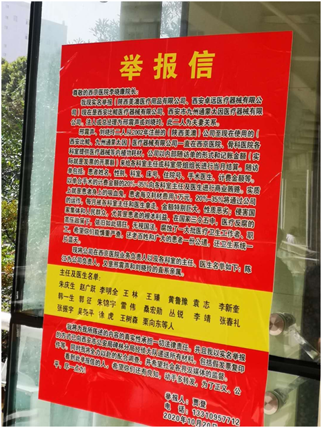 陕西美澳医疗用品有现公司、西安卓远医疗器械有现公司、西安比鲲医疗器械有现公司、西安市九州通蒙太因医疗器械有现公司。上述公司一直在西京医院、骨科医院各科室提供医疗器械等内植物耗材,并向科室主任、医生进行商业贿赂。举报信公布了西京医院业务负责人以及各科室的主任、医生名单。公司以内部随访单的形式和记账金额(实际就是发票的开票额)来给各科室主任或科室带组组长进行当月结算。随访单包括:患者姓名、性别、科室、床号、住院号、手术医生、计费金额等。以单台手术的计费金额的20%-35%向各科室主任及医生进行商业贿赂。患者每交耗材费用1万元,20%-35%将通过公司的运作,给月被各科室主任和医生拿走,金额特别巨大。医院频频出现举报信,和当前药品市场白热化竞争有密不可分的关系,在日益增大的业绩压力和利益冲突下,举报信将会纷纷爆出。10月16日高值耗材全国集采打响第一枪,入围企业压力巨大。天津市医药采购中心发布《国家组织冠脉支架集中带量采购文件》,集采文件最终确定,首批国家集中带量采购的冠脉支架品种首年意向采购量超过107万个,涉及27个产品,金额超123亿元,占据心脏支架市场规模80%。药品的国家集采让药价有了悬崖式下降,和药品集采一样,本次冠脉支架国家带量采购的本质是压缩中间流通环节,对于生产厂家来说不仅会降低市场和销售费用,同时促进头部企业的进一步成长,厂家之间的竞争更加激烈。近期,一系列医药企业行贿案、举报信被密集曝光,整个医药行业的合规压力都在飙升。国家打出一系列遏制药价虚高的组合拳,国家卫健委、中纪委等多部门陆续发文,整治医药耗材企业回扣行为。