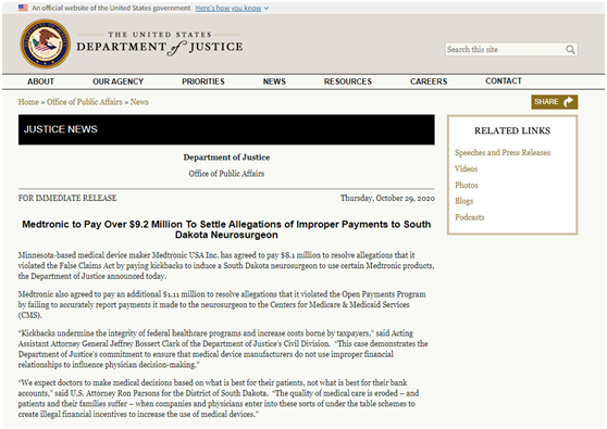 10 月 29 日,美国司法部(DOJ)宣布,总部位于明尼苏达州的美敦力美国公司同意支付 810 万美元,以解决有关其违反《虚假申报法》(False Claims Act)的指控,即支付回扣,诱导一名南达科他州神经外科医生使用某些美敦力公司产品。另外,美敦力还同意另外支付 110 万美元,以解决其违反医疗资助公开支付项目(OPP)的指控,即未能向美国医疗保险和医疗补助服务中心(CMS)准确报告向神经外科医生支付的款项。据司法部称,美敦力公司员工在该事件中的行为不正当,美敦力员工将神经外科医生威尔逊•阿斯福拉(Wilson Asfora)确定为该南达科他州的“目标医师”,美敦力知晓该医生拥有一家餐厅。Asfora告诉美敦力员工,狂欢节的业务进展缓慢,并要求它为餐厅的活动付费。美敦力同意该神经外科医生Asfora的要求,支付一家巴西烧烤餐厅的社交活动费用。并诱使Asfora使用该公司的SynchroMedII鞘内输液泵(用于向患者输送药物的植入设备),还应他要求向Asfora的餐厅支付了款项,但对CMS少报了这些款项。