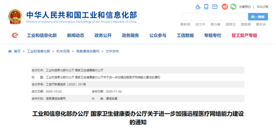 11月2日,工信部、国家卫健委联合发布《关于进一步加强远程医疗网络能力建设的通知》(以下简称《通知》)。通知提出扩大网络覆盖、提高网络能力、推广网络应用、加强组织保障等四方面十六项举措。在扩大网络覆盖方面,《通知》除了要求基础电信企业持续推进偏远和贫困地区光纤宽带和4G网络建设以外,还要求面向有条件的地区和应用需求明确的医疗卫生机构,加快推进5G网络建设,充分发挥5G网络低时延、大连接、高带宽的特点,应用5G切片、边缘计算等先进技术,为远程医疗提供更优网络能力。《通知》要求,建立各级医疗卫生机构宽带接入台账。地方卫生健康主管部门会同通信主管部门建立未通宽带医疗卫生机构清单,摸清底数并定期动态跟踪,提升各级医疗卫生机构网络接入率,2022年实现98%以上基层医疗卫生机构接入互联网。在提高网络能力方面,《通知》要求推动医疗卫生机构网络普遍提速。为采用公众互联网接入的医疗卫生机构提速至100Mb/s以上,采用互联网专线接入的医疗卫生机构提速至20Mb/s以上。在推广网络应用方面,《通知》要求探索5G网络在远程医疗中的创新应用。鼓励有条件的医疗卫生机构与基础电信企业合作,建设5G智慧医疗健康联合实验室或应用示范基地,推动基于5G网络的应用创新和服务创新。鼓励医疗设备厂商开展5G网络制式的研发和适配工作,提升专业设备的5G接入能力,充分发挥5G的技术优势。