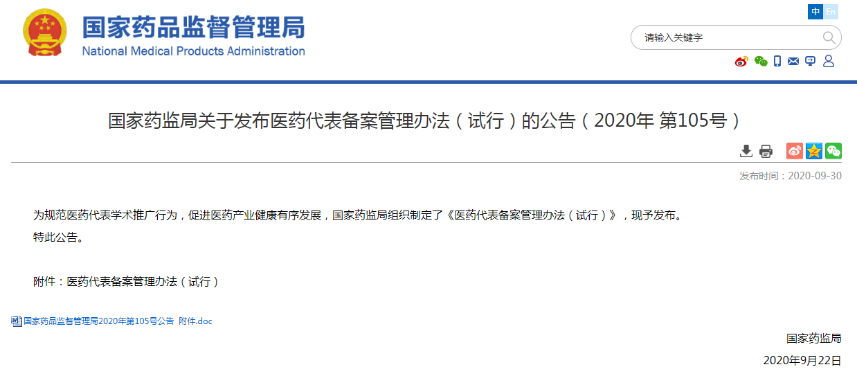 2、据了解,医药代表备案无强制的最后注册时间及公示期期限,视每个药品上市许可持有人的具体工作需要而定,但自今年12月1日起,医疗机构则可按备案要求查询医药代表信息或让医药代表出示备案表。3、备案主体必须是MAH,且每个MAH只能有一个登录注册号。医药代表可由多个MAH备案,但只能是同一个备案号。备案信息中不用上传劳动合同或授权合同,但需填写合同号或授权时效。4、MAH要对若备案的医药代表的信息真实性负责,且对推广过程中出现的所有违规违纪违法问题负第一责任。12月1日,国家药监局发布的《医药代表备案管理办法(试行)》(以下简称办法)将正式施行,医药代表备案制落地实施。从提出到征求意见再到公布和正式执行,医药代表备案制历近4年的时间。这一管理办法的初衷直指规范医药代表的医院内推广行为,根据管理办法,医药代表将不能承担药品销售任务。今年9月30日,国家药监局正式发布管理办法,明确医药代表工作内容、开展学术推广活动的方式、违规推广工作行为界定、药企及上市许可持有人责任等内容。根据管理办法,医药代表是代表药品上市许可持有人在中华人民共和国境内从事药品信息传递、沟通、反馈的专业人员。医药代表通过给医疗机构人员信息传递,进行学术推广,收集药品不良反应信息。