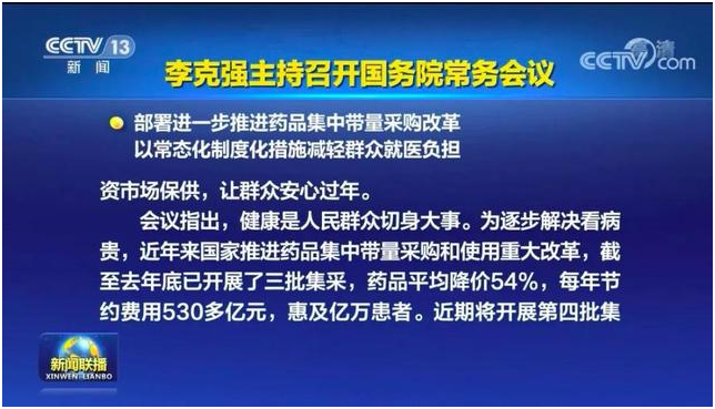45个品种中,21个品种的原研药企2019年在中国公立医疗机构终端占据的市场份额超过50%,其中7个品种由原研药企独占市场,且索拉非尼口服常释剂型、缬沙坦氨氯地平Ⅰ口服常释剂型销售额超过10亿元。勃林格殷格翰和诺华为第四批集采涉及品种较多的外资企业,均有5个品种被纳入;辉瑞、阿斯利康、拜耳、第一三共、杨森等企业,均有产品进入此次国家集采名单。不过,在第三批集采中,部分跨国药企的态度相对冷淡,在现场报高价以直接放弃国采市场。同日,国务院总理主持召开国务院常务会议,部署进一步推进药品集中带量采购改革,以常态化制度化措施减轻群众就医负担。会议指出,近期将开展第四批集采,并扩大医用耗材集采范围。