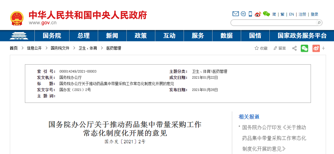 1月28日,国务院办公厅发布《关于推动药品集中带量采购工作常态化制度化开展的意见》(以下简称《意见》)。《意见》含总体要求、明确覆盖范围、完善采购规则、强化保障措施、完善配套政策、健全运行机制、强化组织保障等七方面20条内容。