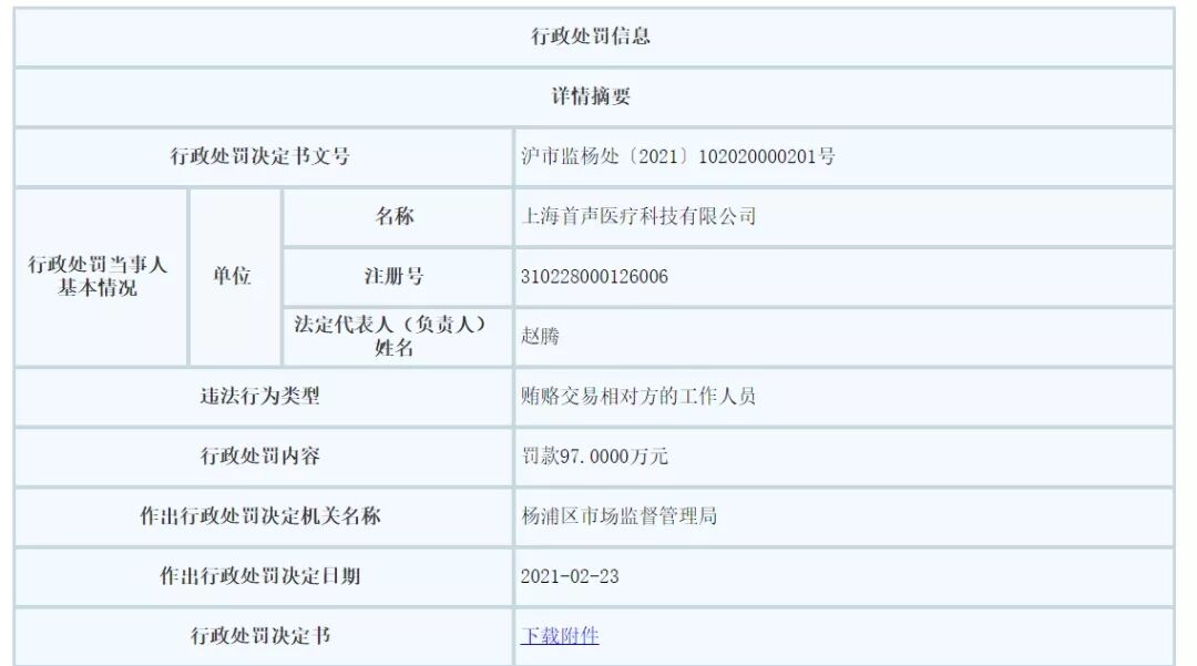 根据该处罚通知附件显示,2020年5月7日,上海市场监督管理局执法人员对当事人上海首声医疗科技有限公司开展执法检查。