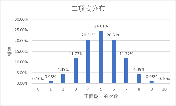故事还没有完,如果游戏规则改为抛两次呢?这时,概率将会发生变化,你会发现,你赢得200元的机会为25%;100元的机会为50%, 啥也没赢到的机会是25%。那么,如果抛10次呢?那么你赢400元,500元或600元的机会为65.63%。这是一个二项式分布概率的计算。计算公式过于复杂,还好,Excel是个好工具,就能帮我们计算出每次抛出正面朝上的概率。如下图所示: