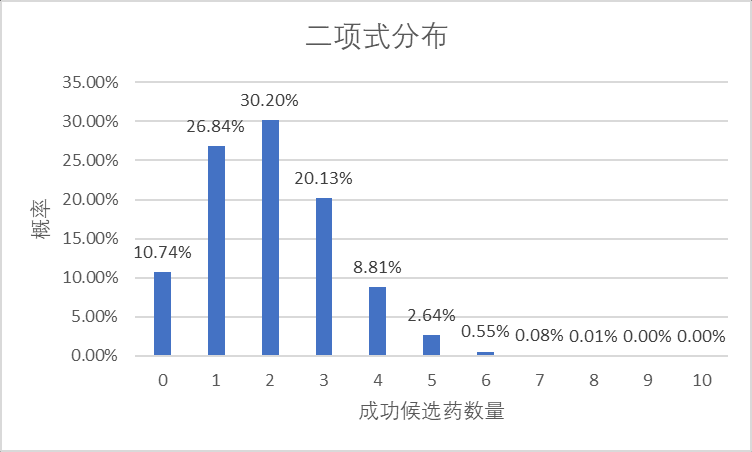 这时,你应该能明白我们可以将给生物医药企业估值类比抛硬币游戏。抛一次硬币,就相当于生物制药企业只有一种候选药在他们的管线里,而抛十次硬币则相当于一家生物制药公司拥有十条产品管线,或者从投资人的角度来看,那就是投资一共有十条管线的数家生物制药公司,其中每家公司可能只有一条管线。如果假设每种候选药最终获得审批的概率只有20%的话,那么只有一条产品管线的生物制药公司,其结果要么成功,要么失败,其成功率也就只有20%。那么对于有10条产品管线的生物制药企业来说,全部失败的概率也是相当低的: 10.7% ((1-20%)^10)。我们知道一条产品管线的公司的失败风险为80%,这样一来,有10条产品管线的生物制药企业完全失败的风险就被降低了近70%。此外,你也会发现一款/两款/三款候选药的成功概率高达77%。所以增加药品管线不仅仅可以大幅降低药品研发完全失败的风险,还可以提升成功率。我们可以从以下二项式分布图看出,这10条产品管线可以产生1款/2款,甚至3款成功上市的候选药,但多于5款则机会甚微。