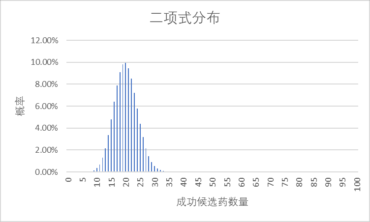 我们可以发现,完全失败的风险概率几乎为0 ((1-20%)^100)。15款到25款候选药的成功率为83.21%。此外,我们也可以看到,超过35款药上市的可能性几乎为0。