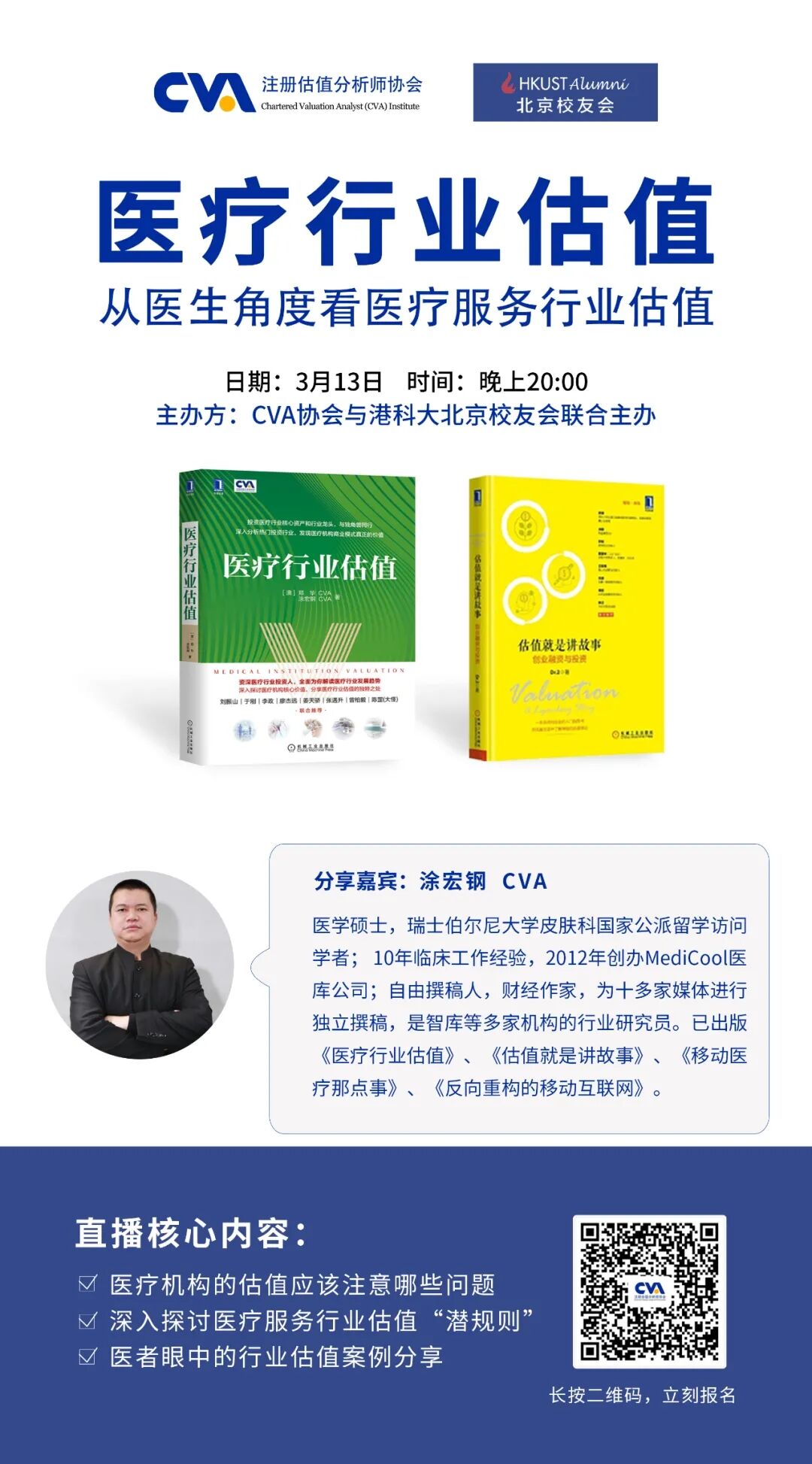 注册估值分析师协会(CVA Institute)特别邀请《医疗行业估值》书籍作者之一涂宏钢先生,围绕医疗行业现状,并结合医疗行业独特的经济,以资本市场明星企业作为分析案例,进行医疗投资分析与探讨。