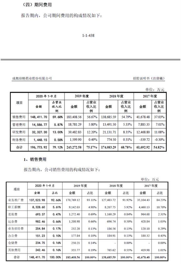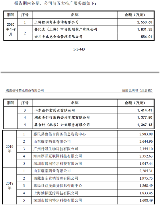 3月12日,成都倍特药业股份有限公司(简称“倍特药业”)创业板指IPO已提交注册。据招股书介绍,倍特药业成立于1995年,主要从事高端仿制药、创新药、原料药的研发、生产和销售。目前在销产品品规超过140个,涵盖抗感染、生殖系统、心血管系统、血液和造血系统等多个细分领域。自2012年被四川方向药业收购后,倍特药业步入发展快车道,历时8年后选择冲击上市。倍特药业招股书显示,近年来,倍特药业的销售费用支出庞大,销售费用占营业收入一半左右。据招股书披露,2017年至2020年1-9月,倍特药业的销售费用分别为为41678.48万元、138685.59万元、183408.56万元、148411.70万元,占当期营业收入的比例分别为37.03%、54.79%、56.67%、59.68%。变数发生在2018年,时年,倍特药业拿出13.87亿元用于产品销售,比去年同期公司的总营收还多出两个亿,全年销售费用激增232.73%。而在销售费用中,业务推广费所占比重高达九成。2017年至2020年1-9月,公司的业务推广费分别为35104.43万元、127483.72万元、170769.12万元、137523.98万元。经统计,报表可追溯的近33个月内,倍特药业累计投入的业务推广费用已达47.05亿元,约为其同期收入的57%。倍特药业如此大额的业务推广规模主要是通过推广服务商进行操作,但我们通过工商资料查询发现,倍特药业的这些推广服务商大多为新成立的公司,很多是上一年度或者本年度刚刚成立,就已经成为公司的年度前五大推广服务商。而且在与倍特药业交易之后又立刻注销。其中,倍特药业2018年与2019年的第三大和第一大推广服务商,分别是惠民县鼎茂商务信息咨询中心与惠民县鲁倍合商务信息咨询中心。工商资料显示,惠民县鼎茂商务信息咨询中心成立于2018年8月23日,注册地址为山东省滨州市惠民县惠民经济开发区乐安二路399号,公司年报显示无人缴纳社保,在鼎茂商务成立的当年,即成为了倍特药业的前五大推广服务商之一,2018年与倍特药业交易金额为1868.49万元,不过,鼎茂商务成立仅一年之后,于2019年8月2日被注销。与鼎茂商务情况类似的惠民县鲁倍合商务信息咨询中心成立于2018年11月1日,注册资本10万元,注册地址为山东省滨州市惠民县惠民经济开发区乐安二路399号,公司年报显示无人缴纳社保,鲁倍合商务在成立的次年就成为了倍特药业的第一大推广服务商,2019年与倍特药业交易金额为2983.08万元,不过,该公司同样于2019年8月5日被注销。2019年第二大服务商山东耀泰药业有限公司的注册地也在山东省惠民县。我们可以发现鼎茂商务与鲁倍合商务之间存在许多的共同点,这两家推广服务商注册地址同样为山东省滨州市惠民县惠民经济开发区乐安二路399号,另外,企查查显示这两家公司的联系邮箱相同,鼎茂商务与鲁倍合商务都在注册后不久就成为了倍特药业的主要推广服务商,并在注册后不久的2019年8月2日与2019年8月5日先后被注销,这两家推广服务商的出现很像是刻意安排所为,换句话说,注册一年,拼命开票,然后快速关闭,再开新公司开票,每一年都做了一个防火墙,今年出事不影响去年,明年有问题不干扰现在吗?好聪明的主意!倍特药业2019年第四大推广服务商海南厚品互联网科技有限公司,交易金额为2353万元。工商信息显示,该公司成立于2017年8月24日,于2020年11月23日申请简易注销,而申请简易程序的理由竟然是“未开业、无债权债务”。那么公开资料显示“未开业”,他开的票是什么?他都做了些什么,贝特给他支付几千万?难道公开承认没有真实业务发生,我只是开票在洗钱吗?我们都能查到的东西,那些保荐机构,券商,审计,律师都是吃白饭的吗?这个现场核查,承诺真实是怎么做到的?上海铿羽商务的咨询公司2020年7月23日才核准更换现在的法人,注册资金1000万,实际缴纳了14.7万资本金,经营期限到2021年5月16日就终止了,缴纳社保的人数是1人。而倍特药业在短短的时间内开了2550万发票。四川鲁比克企业管理有限公司,以及鲁比克(上海)市场策划推广有现公司,成立日期都是2020年4月,就已经成为倍特药业2020年第二大服务商,就是这样的一个公司,在短短的几个月内开具了2380多万的发票。让人搞笑的是好多2020年中旬成立的公司,按照倍特药业的披露,在1-9月给公司做了几千万的学术推广,请问,公司没成立之前,他是如何做推广的?他在空气中推广吗?而且按照倍特的招股说明书,还没有成立的公司,怎么可能获得倍特药业的授权去推广呢?那么成立之后两个月就花了了几千万的推广费用,每周几百万,每天大几十万,这个逻辑何在?对于推广服务商的选取,招股书里明确了推广服务商的选取标准:公司在与推广服务商合作前,应对推广服务商进行必要的筛选,确保推广服务商有资格、有能力、持续与公司合作并促进公司业务在目标区域的健康发展。筛选的条件包括但不限于:A.资格条件:取得推广服务商经营执照、财务报表及纳税记录、违法违规记录等,并通过现场调查和网络调查相结合的方式对推广服务商进行尽职调查;E.在预计的合作区域和合作期限内,推广服务商不推广与公司产品成分相同、相似或可能对公司产品构成竞争的第三方产品。实际情况与选取标准相反,倍特药业为何会出现这么多临时成立并快速注销的推广服务商?这些服务商是否专门为“走账”而存在?推广费的最终去向哪里?是否存在商业贿赂等问题?请那些承诺资料真实签了字的保荐券商,审计和律师除了收