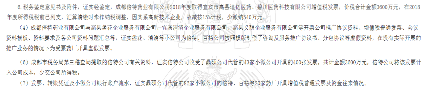 1.税务鉴定意见书及附件,证实经鉴定,成都倍特药业有限公司2018年度取得宜宾市高县追亿医药、碧川医药科技有限公司增值税发票,价税合计金额3600万元,在2018年度所得税税前已列支,汇算清缴时未作纳税调整,因其系高新技术企业,故减按15%计税,少缴纳540万元。