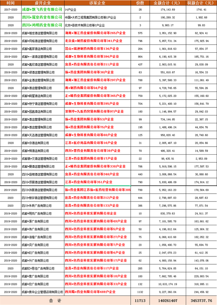 上个月,国家税务总局成都市税务局稽查局发布公告,97家企业被认定虚开发票并送达了《税务处理决定书》的公告,在这认定97家虚开发票的企业中,包含药企3家。该97家虚开的发票流向了上万家企业(9912家),受票(买票)企业遍布全国各地。