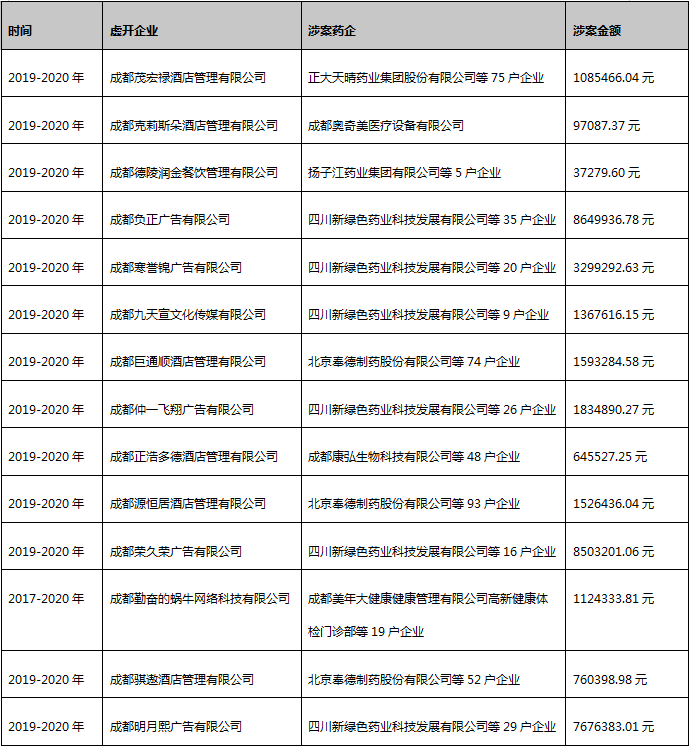 其中,成都茂宏禄酒店管理有限公司 向正大天晴等75户企业开具增值税普通发票145份,金额合计108.54万元,与正大天晴同为中国生物制药集团子公司的 北京泰德制药,在14份处罚书中有三次被点名。扬子江药业等5户企业则接受了成都德陵润金餐饮管理有限公司的9份增值税普通发票。成都本地企业成都康弘生物科技有限公司是上市公司康弘药业的子公司,这次的通报中,成都正浩多德酒店向康弘生物等48户企业开具普通发票90分,金额合计64.55万。这一批处罚决定中被点名最多的是 四川新绿色药业科技发展有限公司,点名6次,涉及的虚开金额、处罚金额也是最高的,其中 1份处罚决定书所涉及开具增值税发票的总金额就超过850万元。