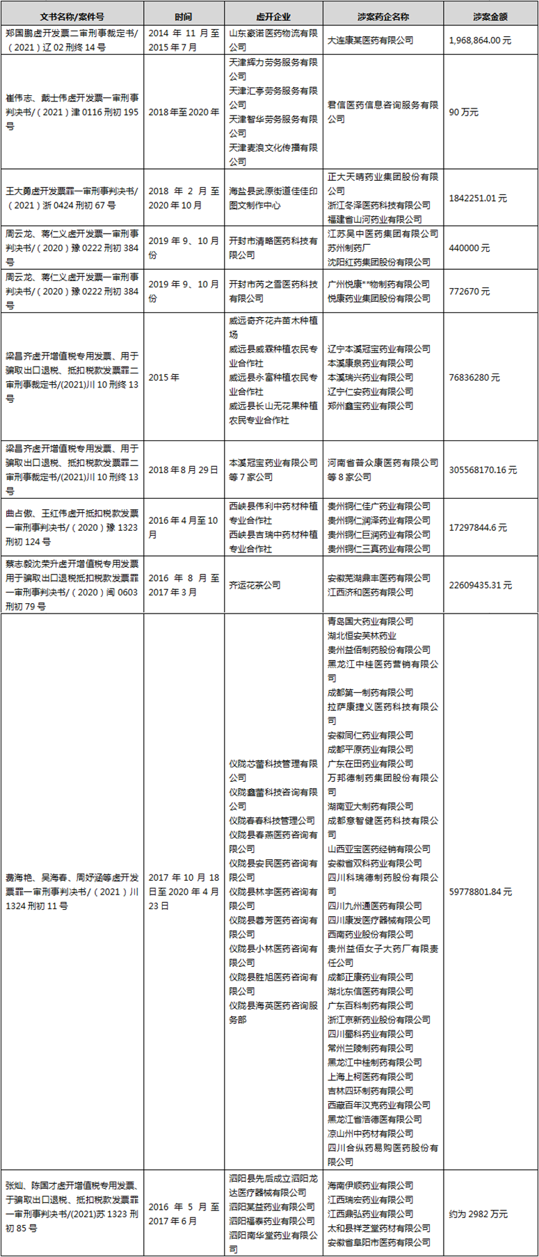 这些收到《税务处理决定书》的企业中, 有14家的虚开发票流向了医药企业,占到总案件数的四分之一,其中不乏 扬子江、正大天晴、美年健康、成都康弘、四川新绿药等知名药企涉案。