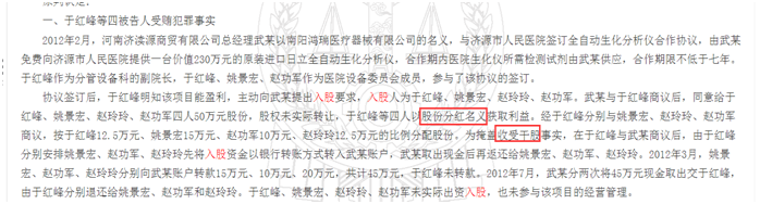 在姚景宏、于红峰受贿二审刑事裁定书中,我们看到医院院长、党委书记、财务科长、设备科长通过持有股份获取不正当利益。