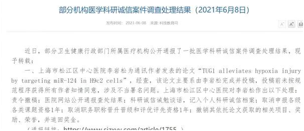 6月8日,国家卫健委科技教育司公布7起机构医学科研诚信案件调查处理结果,提及上海市松江区中心医院、云南省第一人民医院等全国8家公立三级医院,17名医生所涉论文存在论文数据造假、第三方代写等。