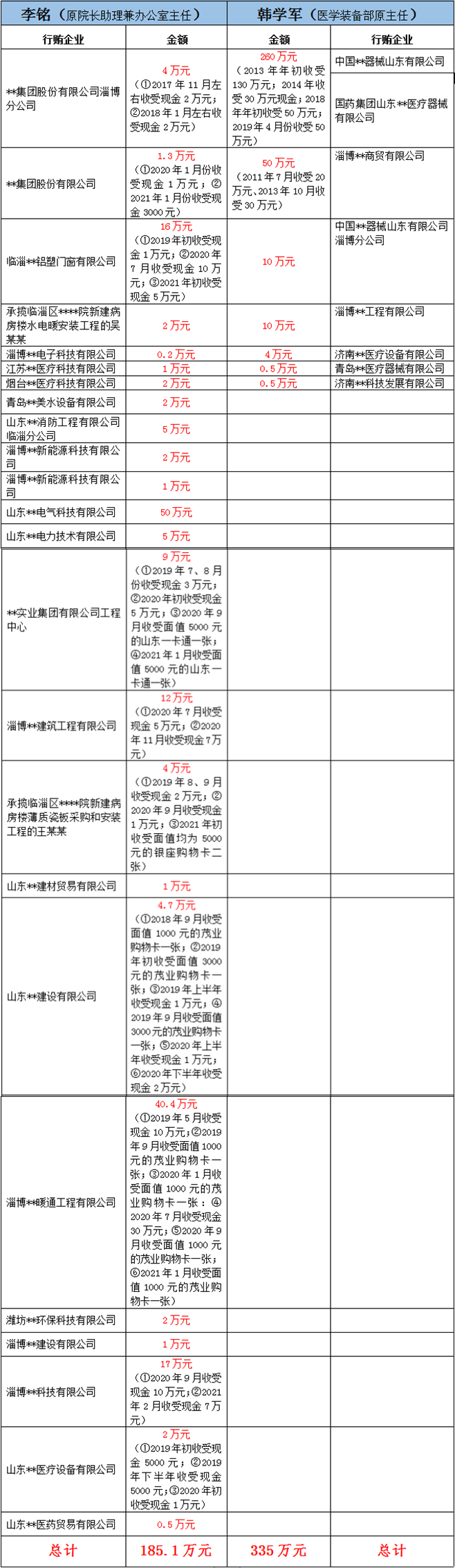 通过对比这两个起诉书可以发现,被告人李铭虽然接受的行贿单位的个数约是被告人韩学军行贿单位的4倍,而且,被告人李铭单笔收受贿赂的金额最高是承揽临淄区****院新建病房楼高压配电外线路施工工程、低压电缆改造项目的山东**电气科技有限公司经理李某某送的好处费50万元,而被告人韩学军单笔受贿金额可达130万元。从受贿总金额来看,被告人韩学军虽然受贿事实没有李铭的数量多,但是受贿金额却是李铭的1.8倍,可见,这单个行贿企业的行贿金额是多么的巨大了。