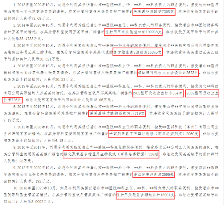 9月9日,中国检察网发布了一个医生在其任职期间,多次接受医药销售人员的贿赂,在其医院开具该医药销售人员代理的药品。