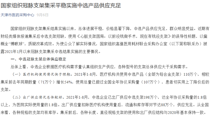 对于这种情况,9月6日,国家组织高值医用耗材联合采购办公室(简称“联采办”)通过天津市医药采购中心微信公众号回应近期有关心脏支架缺货的报道。联采办称,国家组织冠脉支架集采结果实施以来,总体进展平稳,价格显著下降,中选产品供应充足,群众明显受益。联采办表示,自2021年1月冠脉支架集采中选结果实施以来,总体上看,中选企业根据医疗机构需求量认真组织生产供应,各种型号的支架总体供应大于采购需求。
