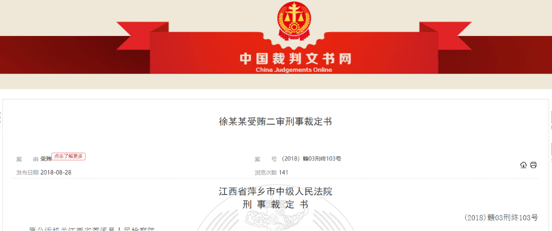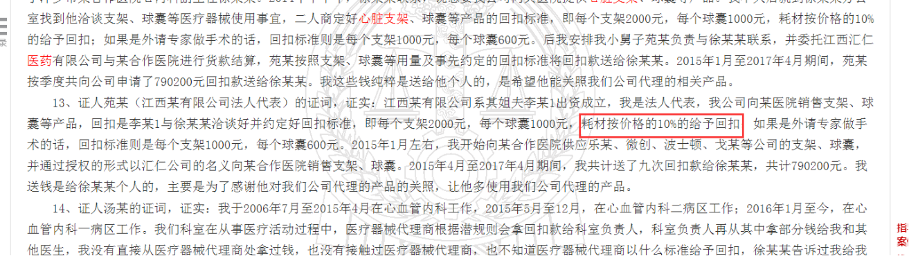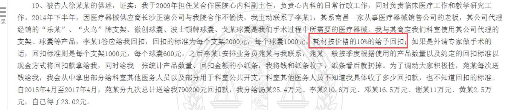 2018年中国裁判文书网发布了一个某合作医院心血管内一科副主任徐莫某在其任职期间为江西某有限公司业务员苑某代理的支架、球囊等医疗器械产品过程中提供帮助,收受贿赂的刑事判决书。