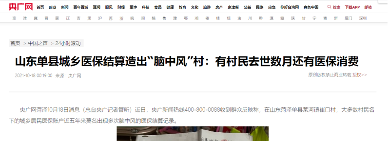 近日,有群众向媒体反映,在山东菏泽单县莱河镇崔口村,从5岁的孩子到去世很长时间的老人,再到一次也没去过村卫生室的在外务工者,多名村民名下的城乡居民医保账户,近五年来莫名出现多次脑中风的医保结算记录。据单县相关部门初步排查,崔口村2000多名村民,起码有37000多条医保结算记录存在问题,类似情况在其他村庄也不同程度存在。目前,当地已成立了联合调查组,并暂停了莱河镇有关村卫生室医保报销资格,国家医保局已派工作组赴山东进行现场督办。