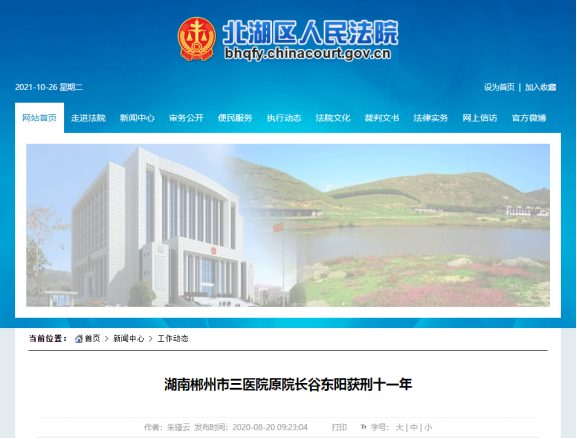 湖南省郴州市北湖区人民法院于2020年4月17日开庭审理了郴州市第三人民医院院长谷东阳因涉嫌受贿罪、巨额财产来源不明罪、滥用职权罪案,同年8月20日再次公开开庭审理并当庭宣判:被告人谷东阳犯受贿罪,判处有期徒刑七年六个月,并处罚金人民币二十万元;犯滥用职权罪,判处有期徒刑二年;犯巨额财产来源不明罪,判处有期徒刑三年;数罪并罚,决定执行有期徒刑十一年,并处罚金人民币二十万元。