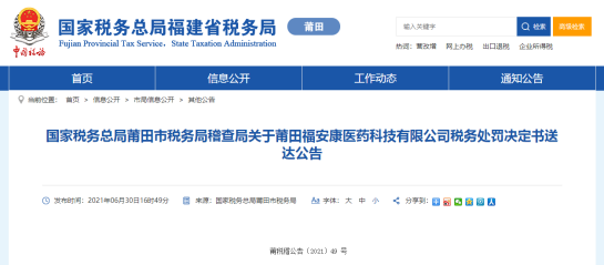 莆田市税务局公示的对莆田福安康医药科技有限公司的税务处罚决定书(莆税稽罚〔2021〕14号)显示,经查实,莆田福安康医药科技有限公司在2017年8月28日-2019年7月8日期间,在无生产经营能力、与受票企业间不存在真实的业务交易情况下,虚构业务为山东威高药业股份有限公司、上海现代制药营销有限公司、三洋药业、福建金山生物制药股份有限公司等虚开增值税普通发票69张,合计金额为455.41万元,税额为13.66万元,价税合计 469.07万元。