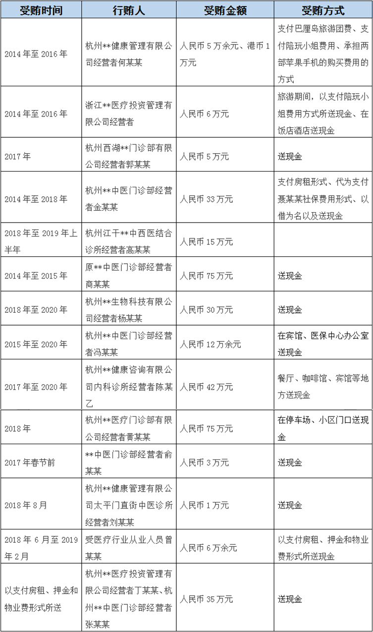 通过整理表格可以发现,被告人杨敏毅在杭州市**管理服务中心医疗审核一处主任科员和医疗审核二处副处长任职期间,他利用他的职责权力为,为医药企业(门诊部)经营者在医保业务等方面谋取利益,而且受贿的方式可谓是五花八门,除了常规的送现金,医药企业(门诊部)还会通过支付房租、押金和物业费、支付巴厘岛旅游团费、支付陪玩小姐费用、承担两部苹果手机费用等方式向其行贿。