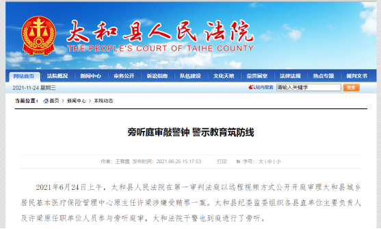 案件于6月24日上午,太和县人民法院在第一审判法庭以远程视频方式公开开庭审理太和县城乡居民基本医疗保险管理中心原主任许梁涉嫌受贿罪一案,被告人许梁当庭认罪认罚,案件将择期宣判。
