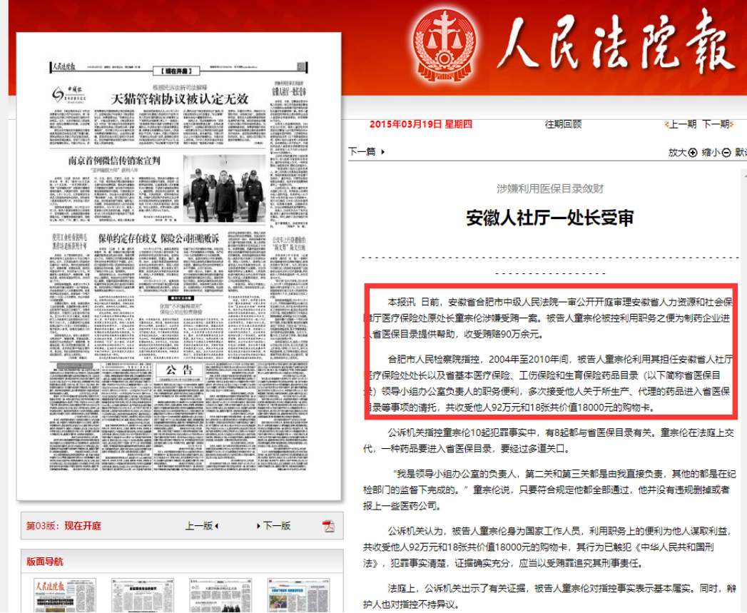 童某即童宗伦,案发前任安徽省人力资源和社会保障厅(以下简称省人社厅)医疗保险处原处长。在童宗伦受贿一案审理的文书显示,合肥市中院审理查明:2004年至2010年间,被告人童宗伦利用其担任省人社厅医疗保险处处长以及安徽省基本医疗保险、工伤保险和生育保险药品目录领导小组办公室负责人的职务便利,多次接受他人关于所生产、代理的药品进入省医保目录等事项的请托,共收受他人人民币92万元和18张共价值18000元人民币的购物卡。