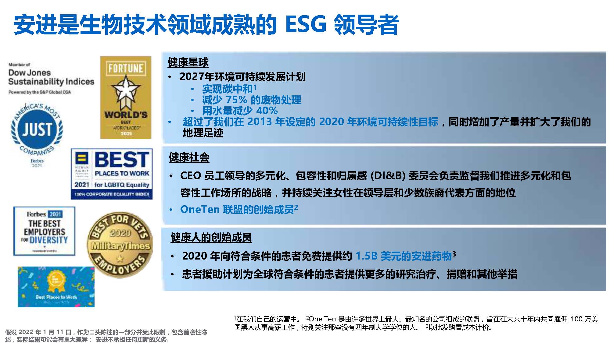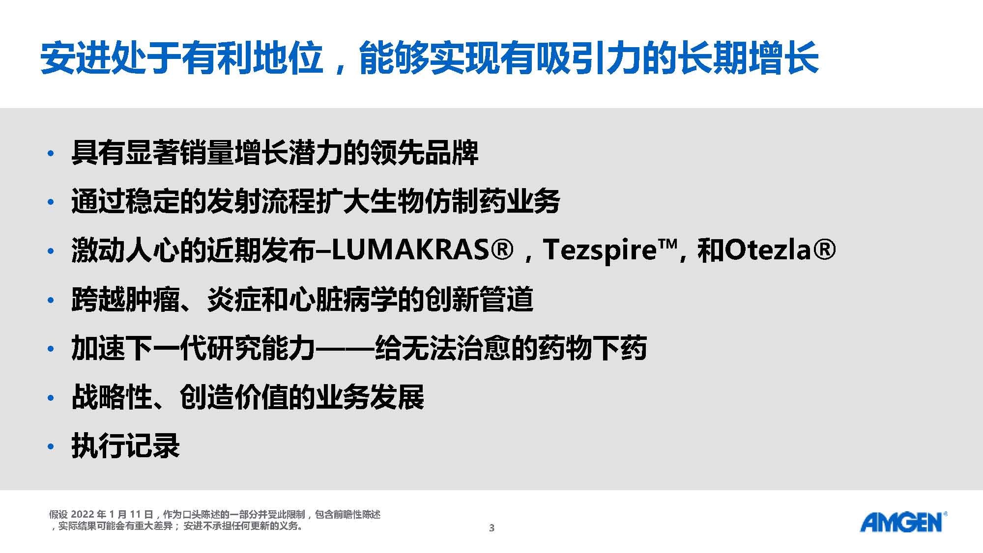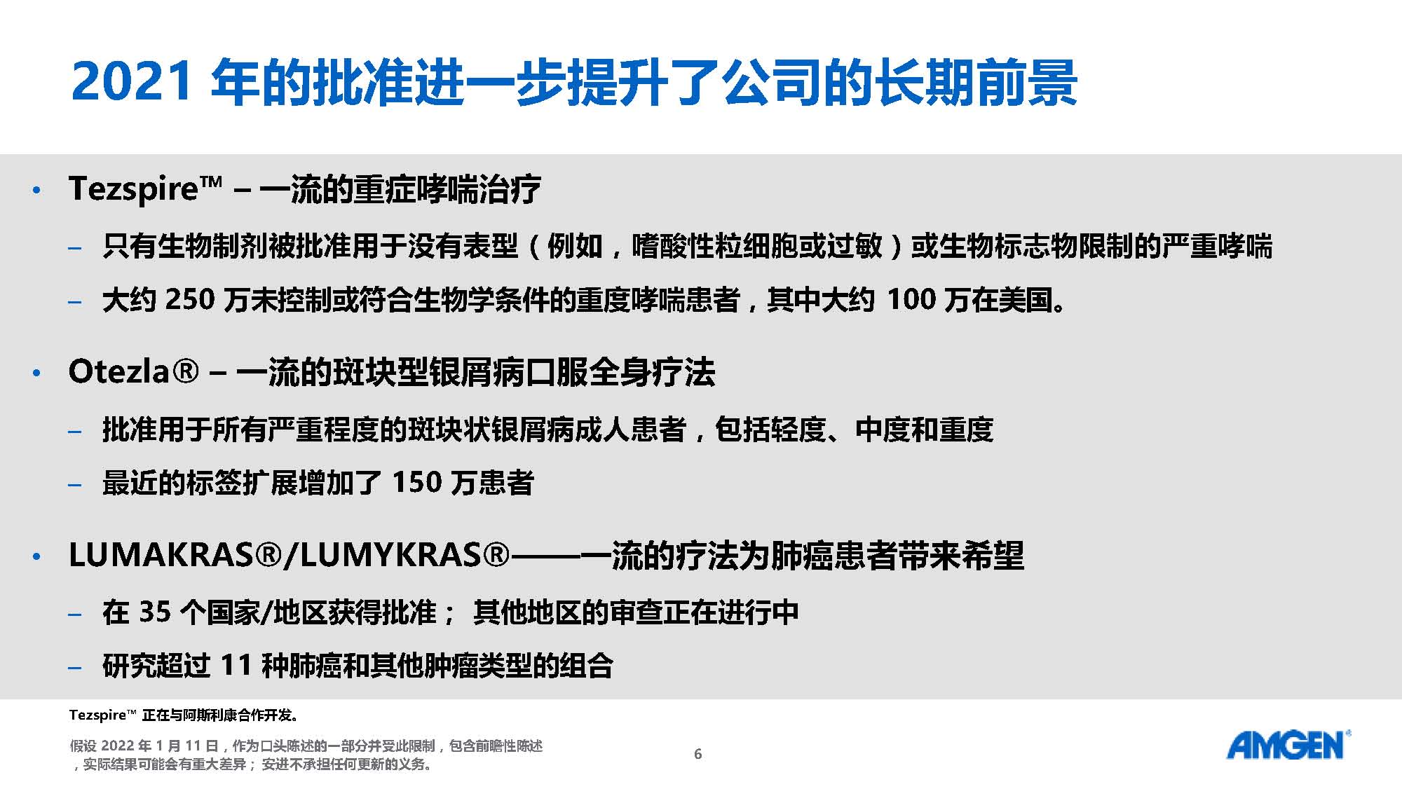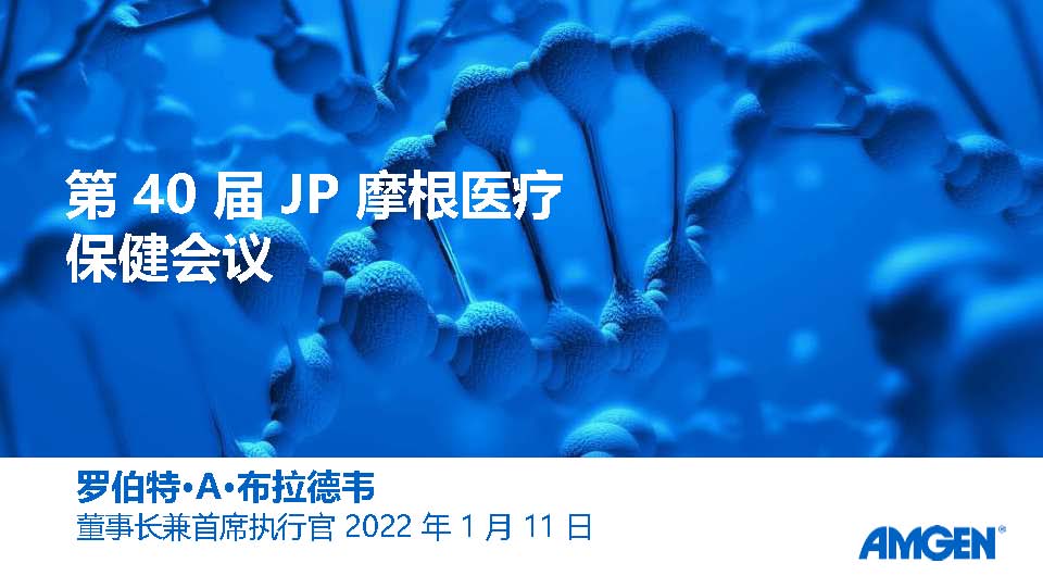 安进公司(Amgen)创立于1980年,主要从事人类创新药物的探索、研发、生产和销售,致力于释放生物学潜力,以造福患有严重疾病的患者。通过借助前沿人类遗传学等工具,安进公司力求揭示疾病的复杂性,洞察人类生物学的基本机制。