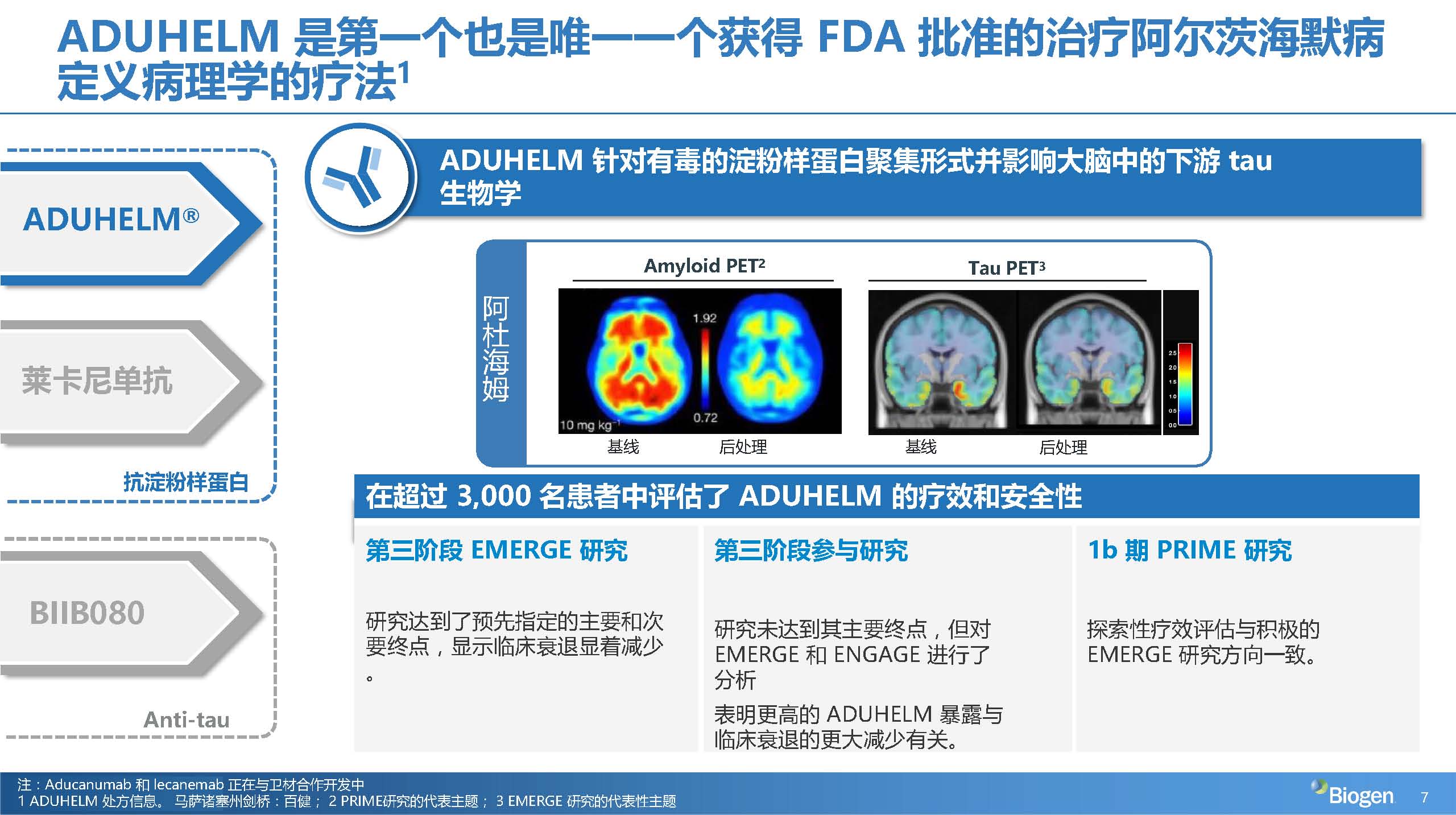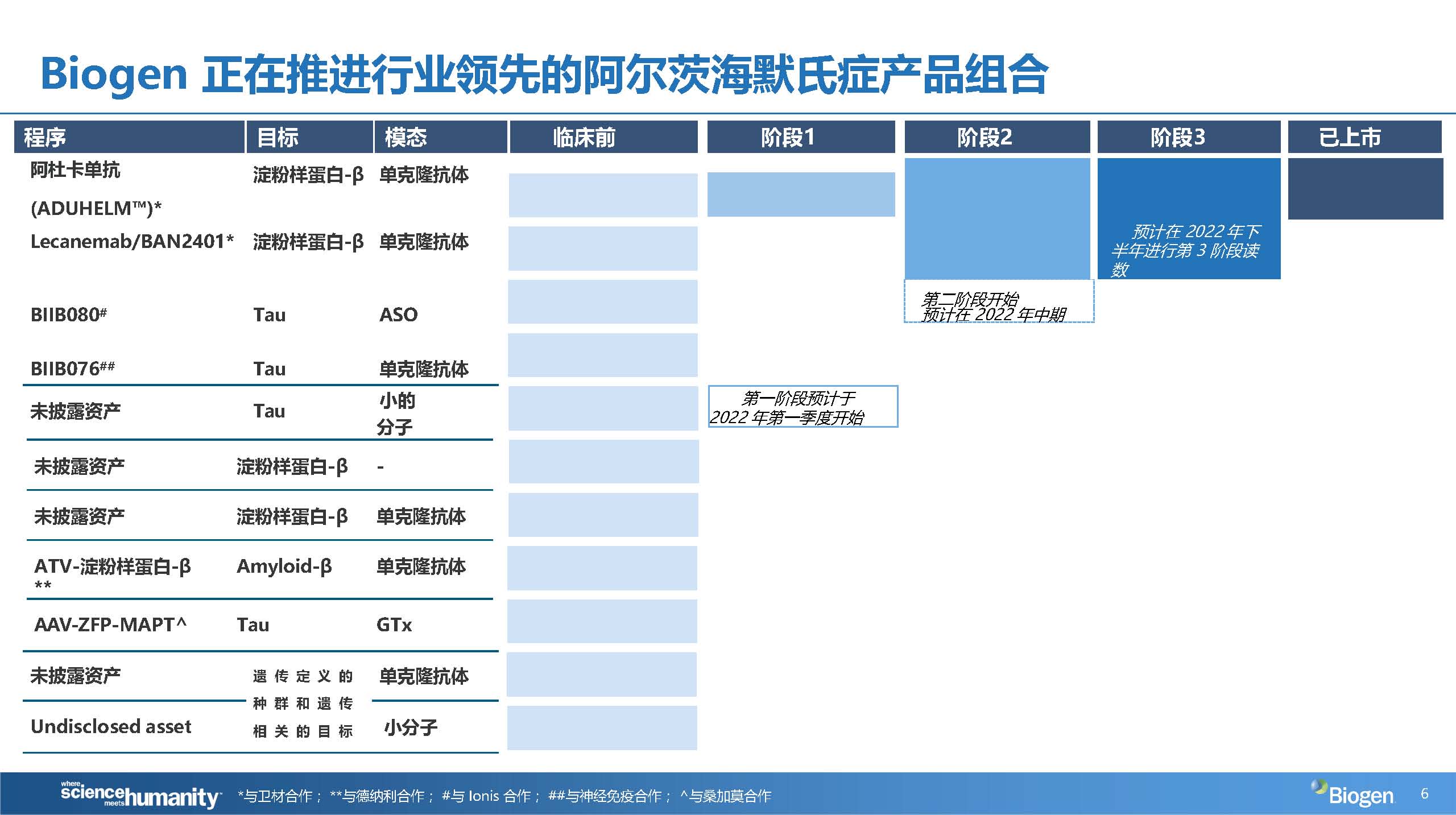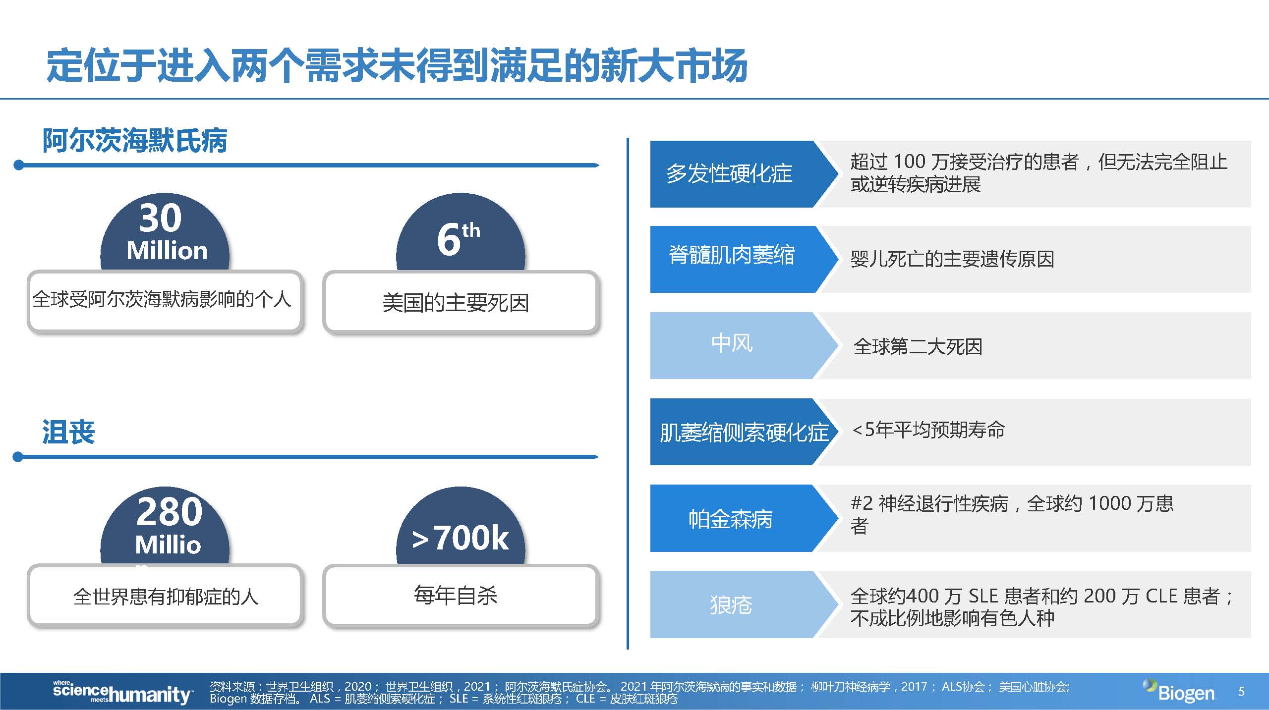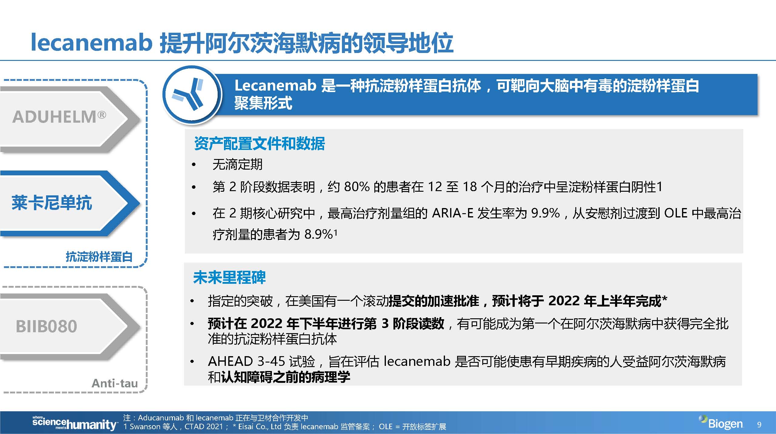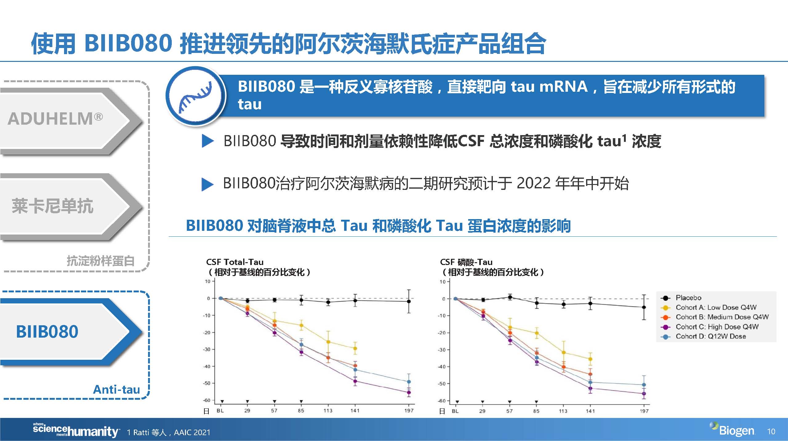 渤健将建立新的特许经营,进入两个需求未得到满足的新大市场:阿尔茨海默氏病和抑郁,Biogen 正在推进行业领先的阿尔茨海默氏症产品组合:ADUHELM 和Lecanemab、BIIB080。ADUHELM 是第一个也是唯一一个获得 FDA 批准的治疗阿尔茨海默病定义病理学的疗法,ADUHELM 针对有毒的淀粉样蛋白聚集形式并影响大脑中的下游 tau 生物学,Lecanemab 是一种抗淀粉样蛋白抗体,可靶向大脑中有毒的淀粉样蛋白聚集形式,而BIIB080 是一种反义寡核苷酸,直接靶向 tau mRNA,旨在减少所有形式的 tau。