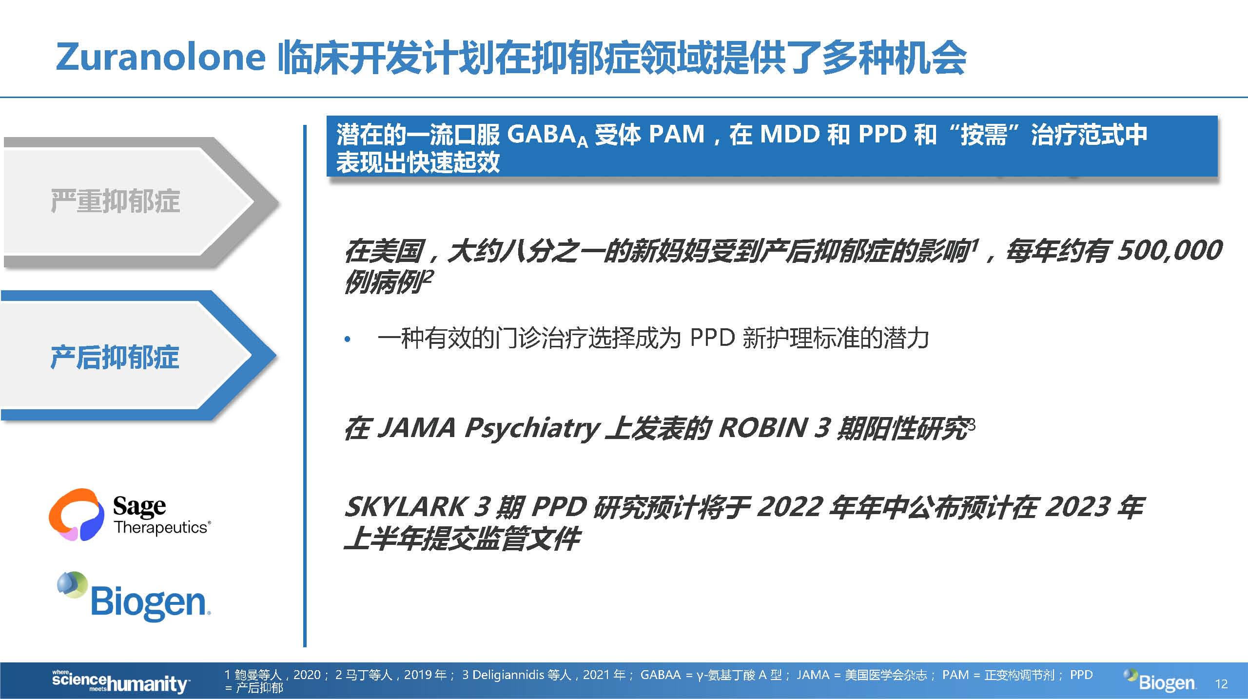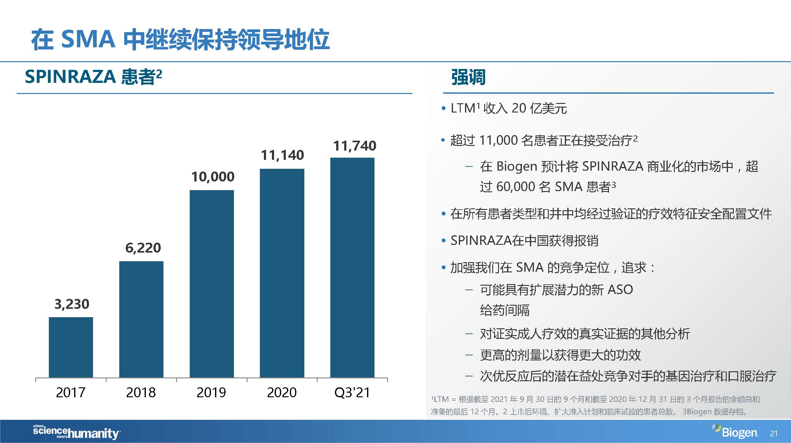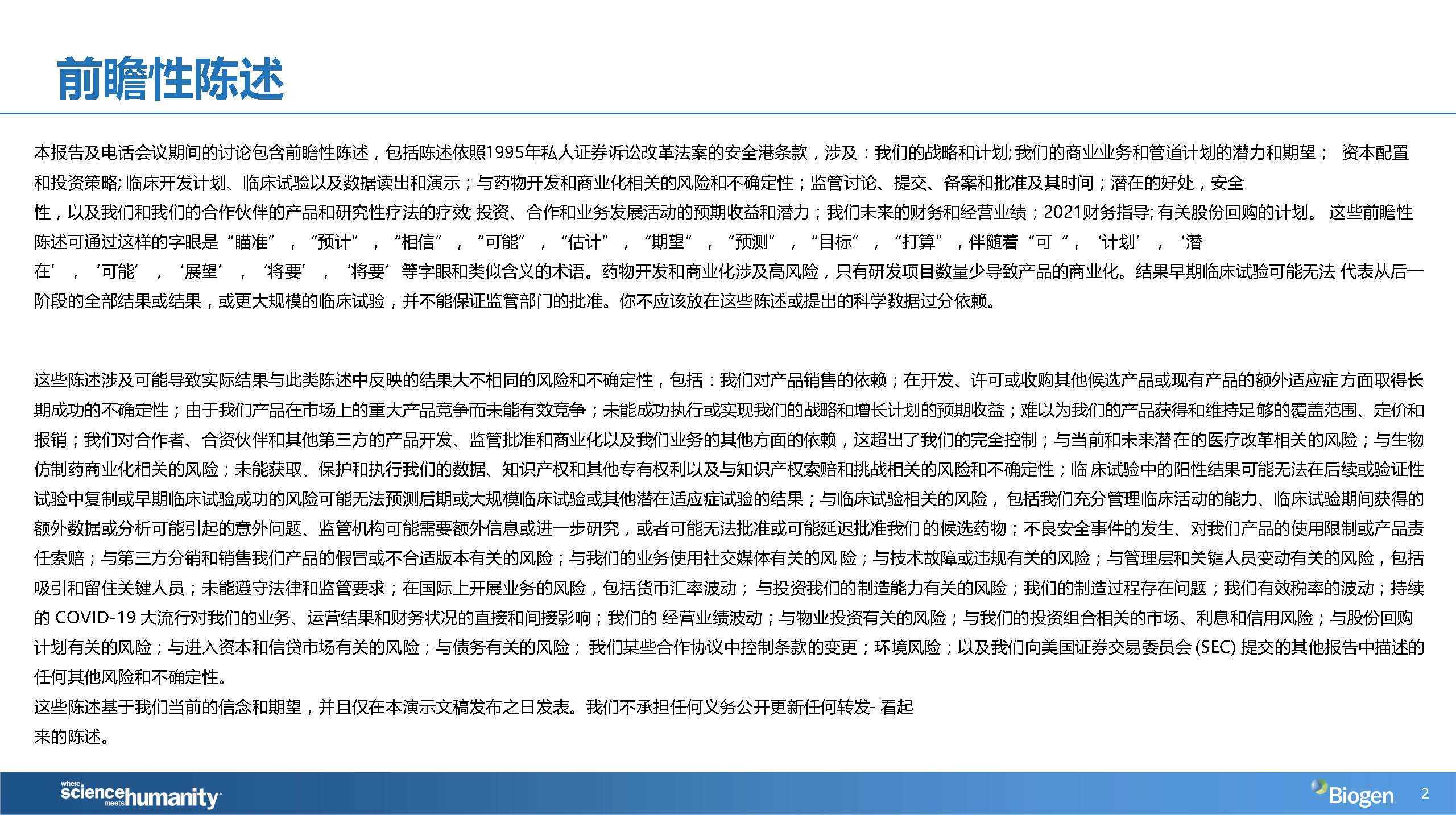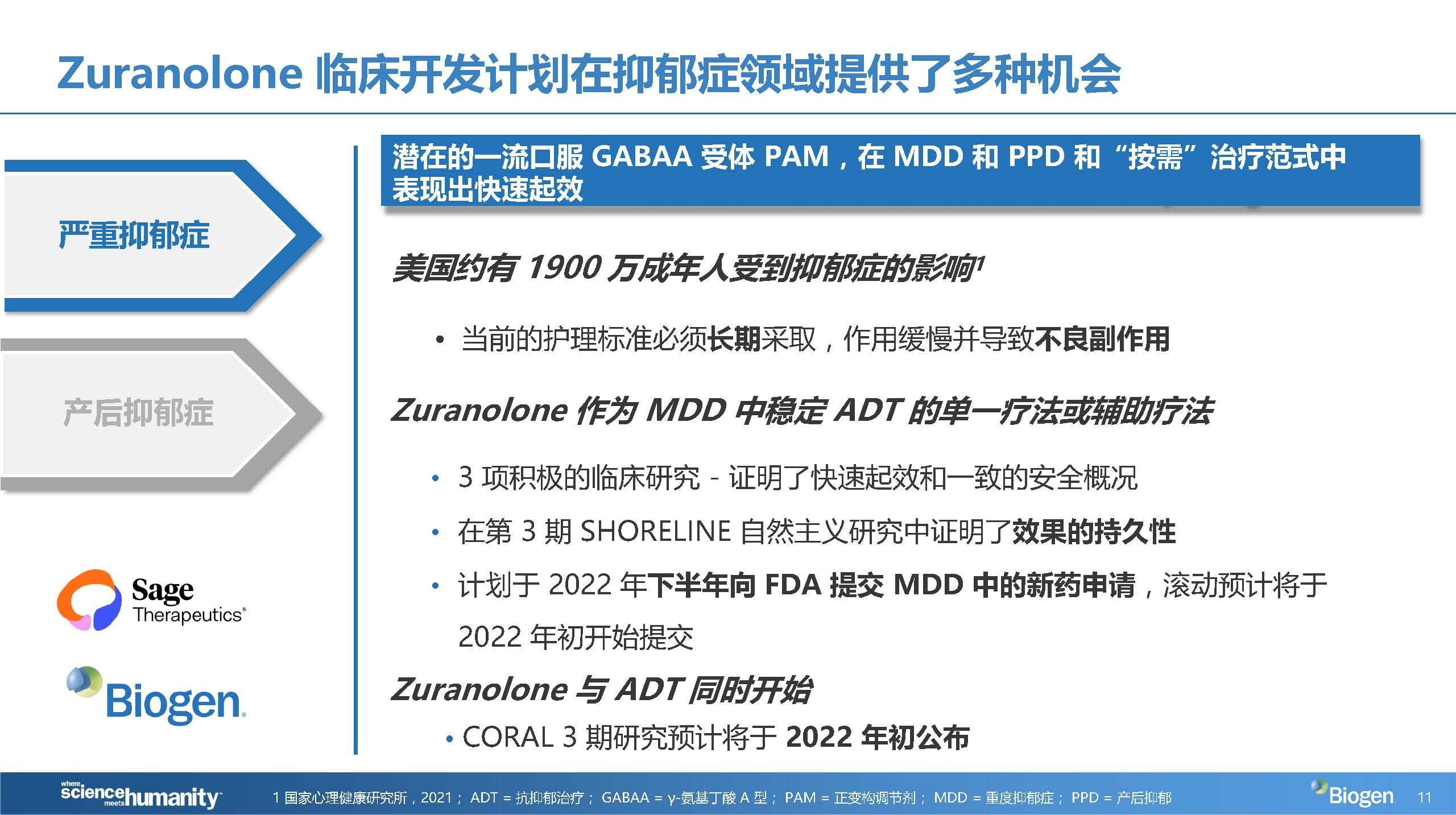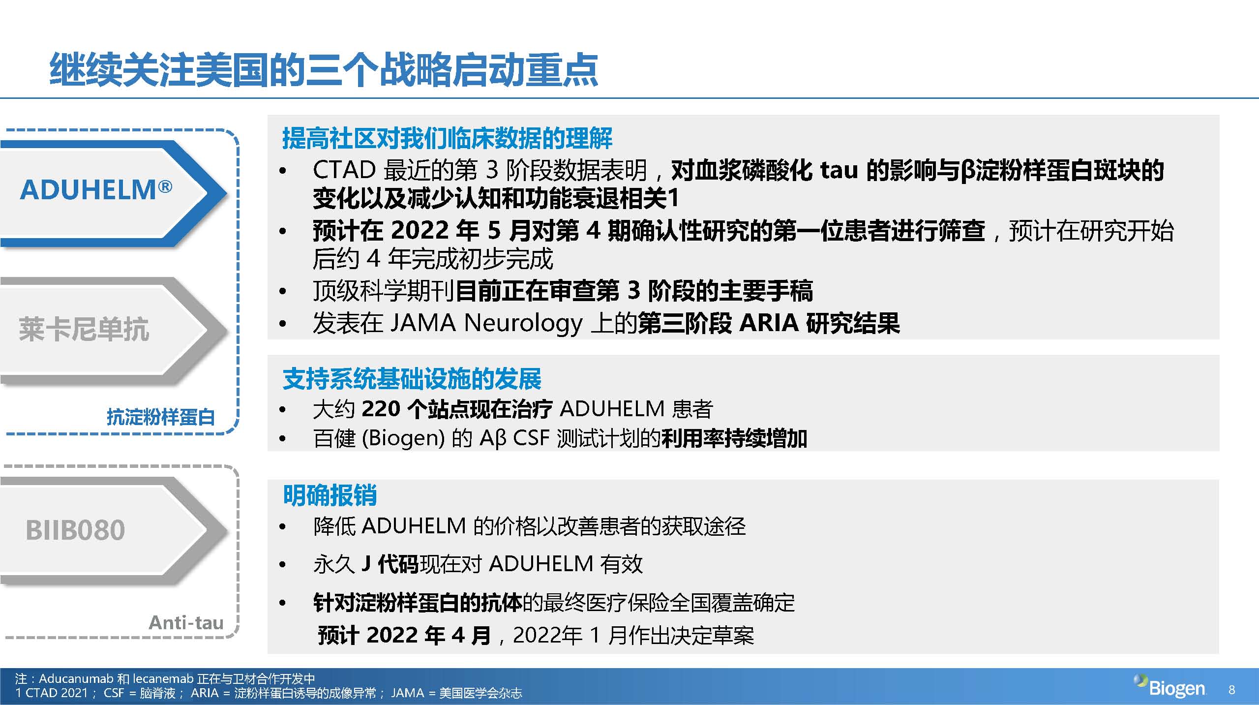 渤健将建立新的特许经营,进入两个需求未得到满足的新大市场:阿尔茨海默氏病和抑郁,Biogen 正在推进行业领先的阿尔茨海默氏症产品组合:ADUHELM 和Lecanemab、BIIB080。ADUHELM 是第一个也是唯一一个获得 FDA 批准的治疗阿尔茨海默病定义病理学的疗法,ADUHELM 针对有毒的淀粉样蛋白聚集形式并影响大脑中的下游 tau 生物学,Lecanemab 是一种抗淀粉样蛋白抗体,可靶向大脑中有毒的淀粉样蛋白聚集形式,而BIIB080 是一种反义寡核苷酸,直接靶向 tau mRNA,旨在减少所有形式的 tau。