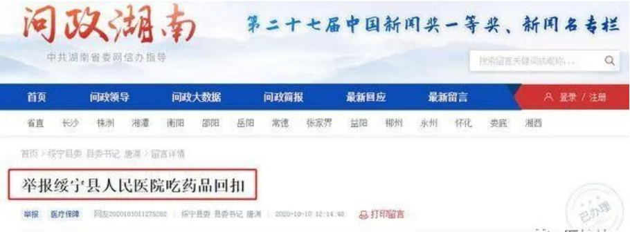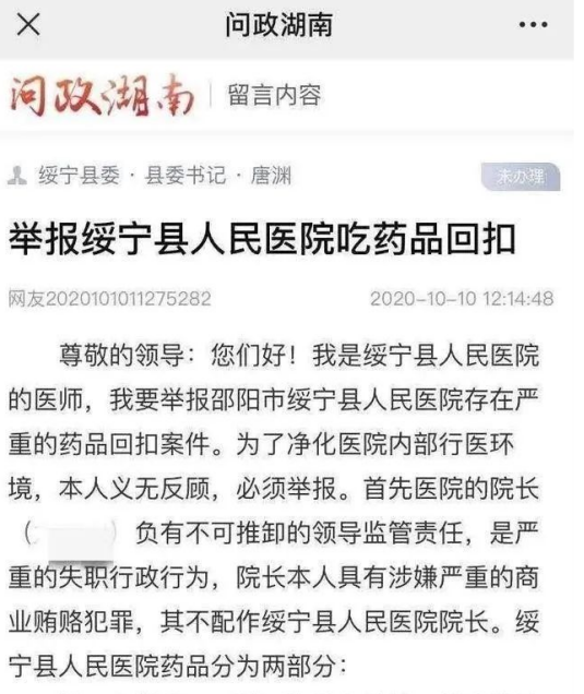 举报者称,自己是绥宁县人民医院的医师,举报医院吃回扣的原因是净化行医环境。在其举报信中,箭头首先直指绥宁县人民医院院长:医院的院长负有不可推卸的领导监管责任,是严重的失职行政行为,院长本人具有涉嫌严重的商业贿赂犯罪,其不配作绥宁县人民医院院长。除此之外,举报信中显示,大药商承包了医院药房,医院98%的药品属于两位大老板。其中,大药商给的回扣是:抗生素10%-15%/支,泮托拉唑针剂、奥美拉唑针剂10元/支;丹红注射液25元/支;氨溴索、异丙托溴铵2-3元/支。