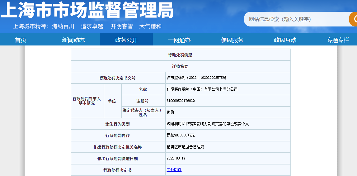上海市市场监管局网站显示,因贿赂利用职权或者影响力影响交易的单位或者个人,佳能医疗系统(中国)有限公司上海分公司被上海市杨浦区市场监管局罚款98万。