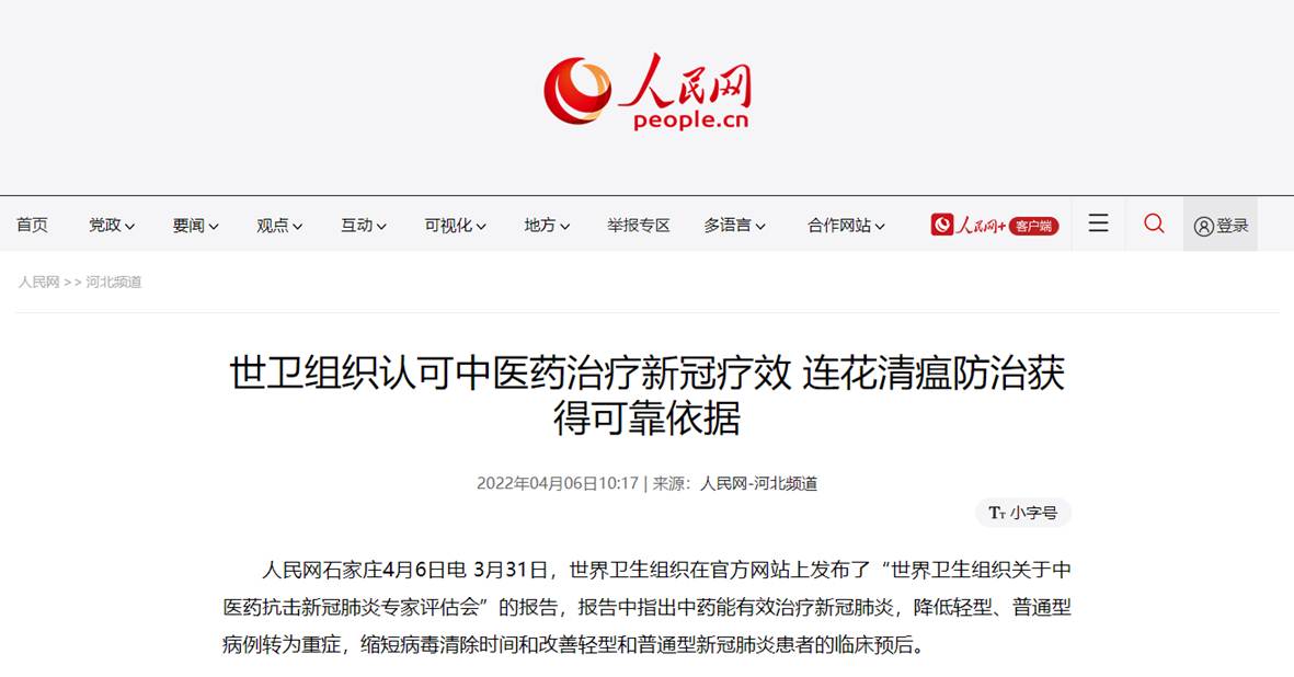 1、人民网石家庄4月6日发布新闻:《世卫组织认可中医药治疗新冠疗效 连花清瘟防治获得可靠依据》,“报告中指出中药能有效治疗新冠肺炎,降低轻型、普通型病例转为重症,缩短病毒清除时间和改善轻型和普通型新冠肺炎患者的临床预后。”各大平台转载。
